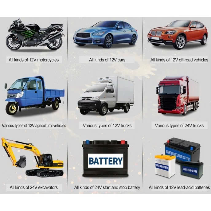 Tương thích đa năng: Sạc được ắc quy 12V và 24V cho ô tô, xe máy, xe tải, xe điện, bình điện năng lượng mặt trời, v.v.