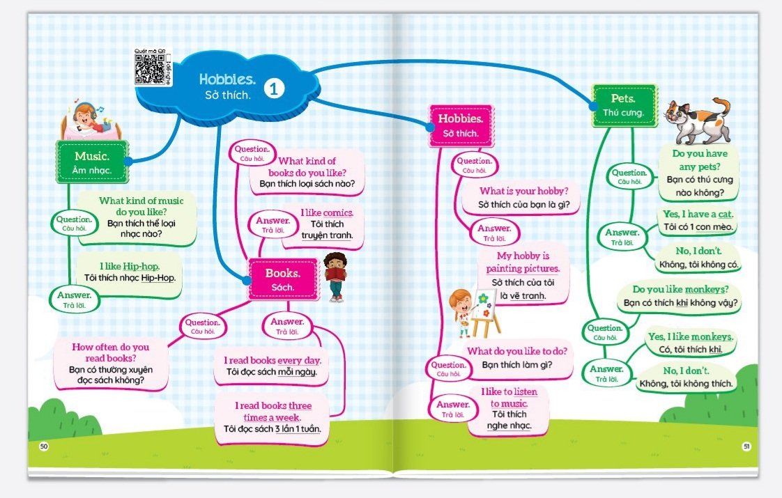 - KÈM THEO FILE ĐỌC TIẾNG ANH GIỌNG CHUẨN BẢN ĐỊA – QUÉT MÃ QR Để giúp cho trẻ có thể học nhanh, nhớ lâu, dễ dàng ôn tập, tự tin giao tiếp. Chúng tôi xin giới thiệu cuốn sách 1001 MẪU CÂU GIAO TIẾP TIẾNG ANH THÔNG DỤNG – THEO SƠ ĐỒ TƯ DUY MIND MAP, với hơn 30 chủ đề thường gặp trong cuộc sống hàng ngày và các mẫu câu giao tiếp thông dụng được trình bày theo dạng Sơ đồ tư duy Mind map rất logic, đơn giản và dễ hiểu. Kết hợp cùng với cuốn Chinh phục từ vựng tiếng Anh – Theo Sơ đồ tư duy Mind map, bộ 2 cuốn sách sẽ là cẩm nang giúp trẻ nắm vững hệ thống từ vựng tiếng Anh và giao tiếp tiếng Anh một cách tự tin, hiệu quả nhất. Đặc biệt, cuốn sách có kèm theo File đọc tiếng Anh giọng chuẩn bản địa, quét mã QR trên sách theo từng chủ đề, sẽ giúp trẻ luyện kĩ năng nghe – nói tốt hơn và phát âm chuẩn hơn. HƯỚNG DẪN BẢO QUẢN SÁCH THIẾU NHI: