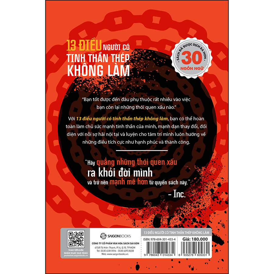 Tựa sách 13 điều người có tinh thần thép không làm gồm 13 chương, viết về 13 thói quen xấu đang kìm hãm mỗi người trong chúng ta khám phá và khai thác mọi đức tính và phẩm chất tốt trong chính mình.