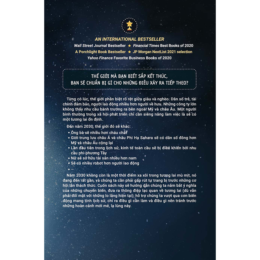 Năm 2030, không còn là một thời điểm xa xôi trong tương lai mù mịt, nó đang đến rất gần, và chúng ta cần phải gấp rút tự trang bị trước những cơ hội lẫn thách thức. Cuốn sách này sẽ hướng dẫn chúng ta nắm bắt ý nghĩa của những chuyển biến, đưa ra thông điệp lạc quan về tương lai (dù vẫn phải đối mặt với những lo lắng hiện tại); hỗ trợ chúng ta vượt qua cơn biến động mang tính lịch sử, chỉ ra điều gì cần làm và điều gì nên tránh trước những hoàn cảnh mới mẻ, lạ lùng này.