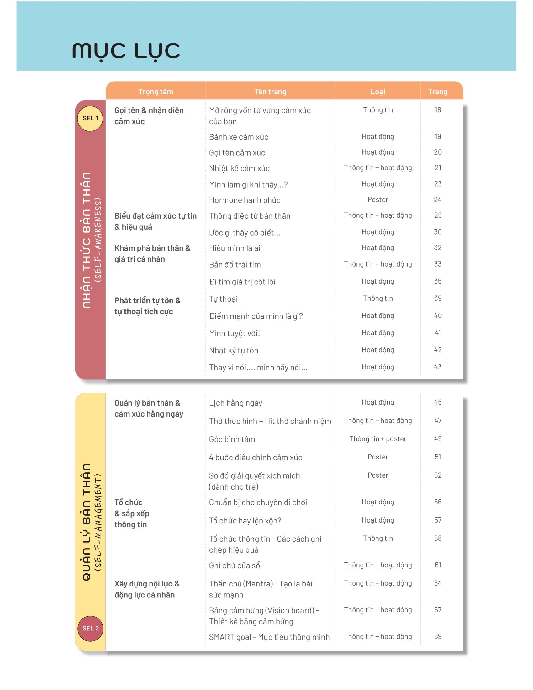 Với 50+ hoạt động phát triển năng lực cảm xúc – xã hội, cha mẹ và thầy cô sẽ được cung cấp hơn 50 hoạt động thực hành cụ thể, sinh động và dễ dàng áp dụng trên lớp, trong gia đình hoặc các buổi sinh hoạt nhóm. Đây là những hoạt động được thiết kế khoa học, rõ ràng với những ưu điểm nổi bật sau: