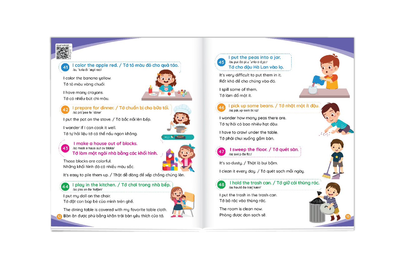Sách có kèm file nghe quét mã QR với giọng đọc tiếng Anh chuẩn để cha mẹ và con cùng nghe và tắm ngôn ngữ mỗi ngày.