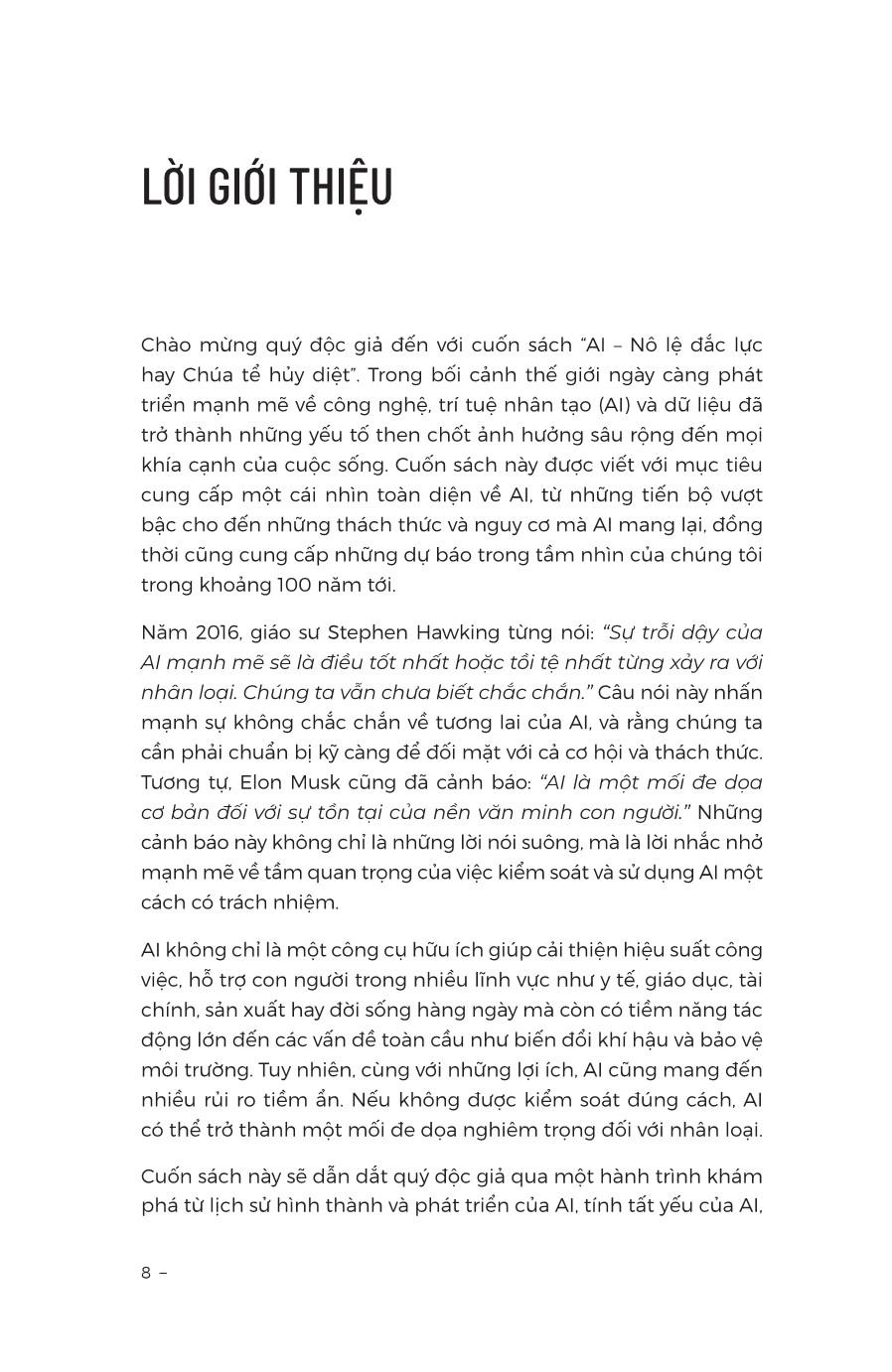 Chào mừng quý độc giả đến với cuốn sách “AI – Nô lệ đắc lực hay Chúa tể hủy diệt”. Trong bối cảnh thế giới ngày càng phát triển mạnh mẽ về công nghệ, trí tuệ nhân tạo (AI) và dữ liệu đã trở thành những yếu tố then chốt ảnh hưởng sâu rộng đến mọi khía cạnh của cuộc sống. Cuốn sách này được viết với mục tiêu cung cấp một cái nhìn toàn diện về AI, từ những tiến bộ vượt bậc cho đến những thách thức và nguy cơ mà AI mang lại, đồng thời cũng cung cấp những dự báo trong tầm nhìn của chúng tôi trong khoảng 100 năm tới.