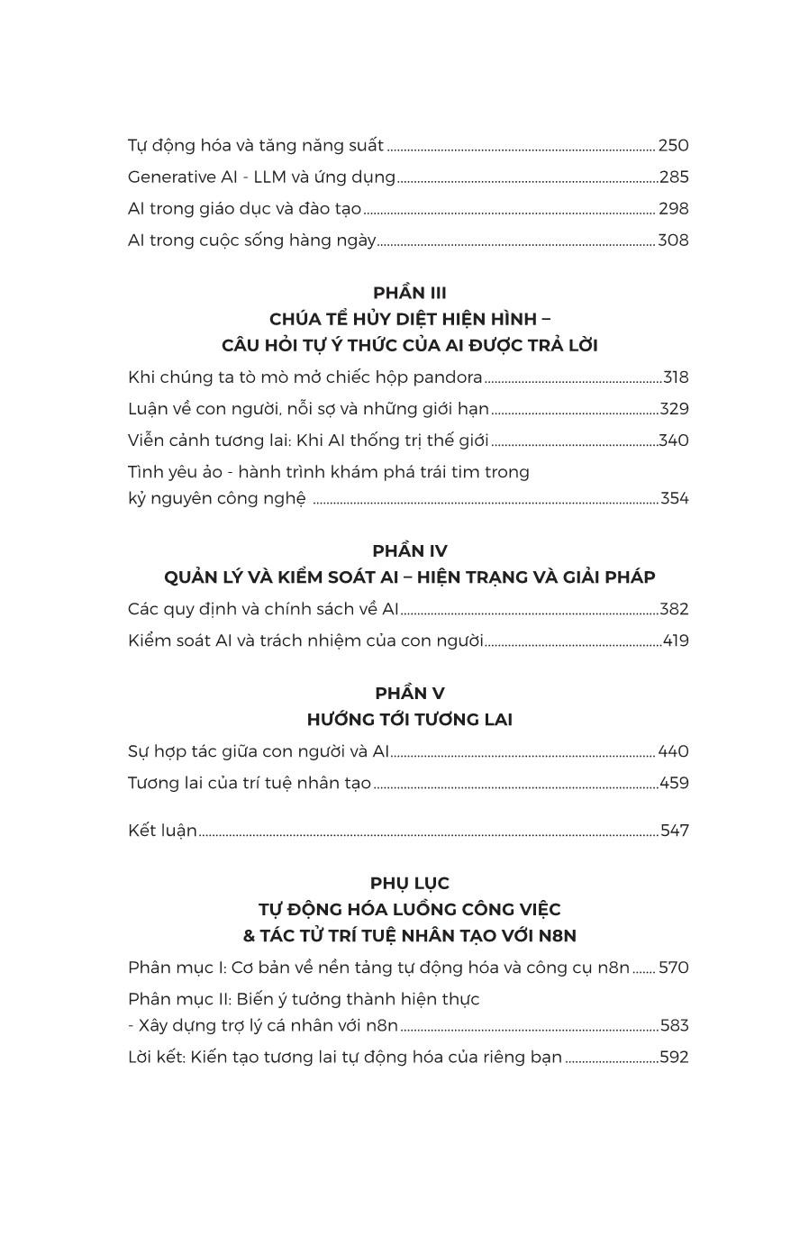 AI không chỉ là một công cụ hữu ích giúp cải thiện hiệu suất công việc, hỗ trợ con người trong nhiều lĩnh vực như y tế, giáo dục, tài chính, sản xuất hay đời sống hàng ngày mà còn có tiềm năng tác động lớn đến các vấn đề toàn cầu như biến đổi khí hậu và bảo vệ môi trường. Tuy nhiên, cùng với những lợi ích, AI cũng mang đến nhiều rủi ro tiềm ẩn. Nếu không được kiểm soát đúng cách, AI có thể trở thành một mối đe dọa nghiêm trọng đối với nhân loại. Cuốn sách này sẽ dẫn dắt quý độc giả qua một hành trình khám phá từ lịch sử hình thành và phát triển của AI, tính tất yếu của AI, các ứng dụng hiện tại, đến những rủi ro và vấn đề đạo đức mà chúng ta phải đối mặt. Chúng tôi sẽ cùng bạn tìm hiểu cách mà AI có thể trở nên độc hại, những biện pháp kiểm soát cần thiết để đảm bảo rằng AI luôn hoạt động dưới sự giám sát của con người và quan trọng hơn hết, cách chúng ta có thể sử dụng AI một cách an toàn và có trách nhiệm. Đồng thời, cuốn sách cũng cung cấp những dự báo của chúng tôi về robot, siêu trí tuệ nhân tạo (ASI), điểm kỳ dị AI, xã hội kiểm soát toàn diện, hoặc sự bùng nổ kinh tế và nhiều chủ đề khác.