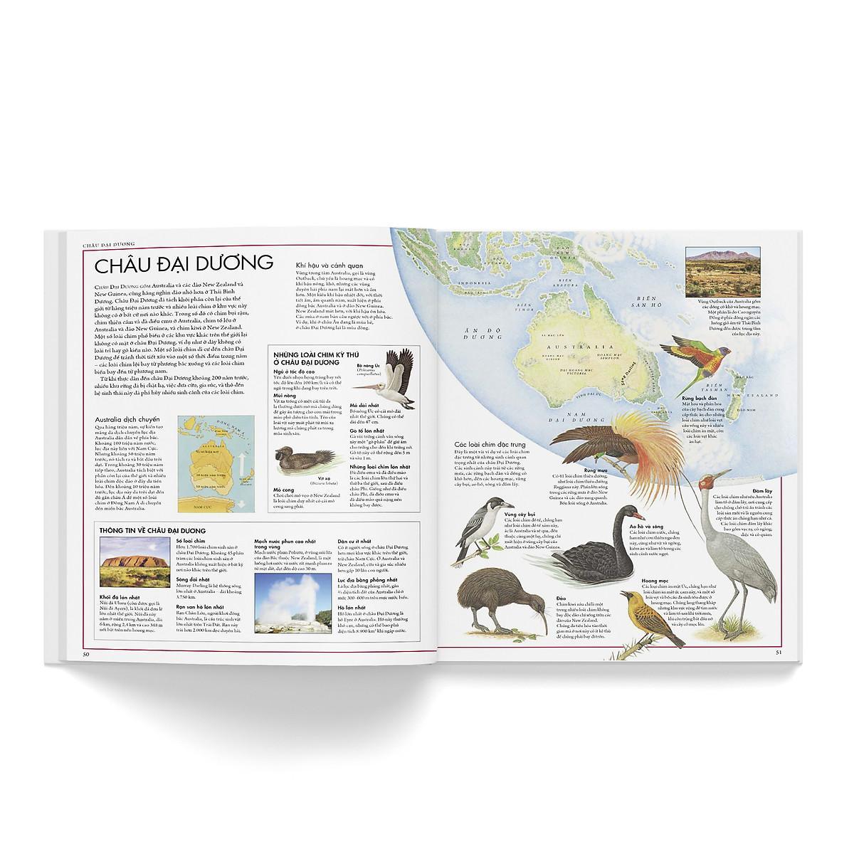 Atlas các loài chim - Bách khoa bằng hình về các loài chim trên thế giới mang đến một góc nhìn đẹp đẽ và đắm say về thế giới các loài chim với hàng loạt hình ảnh minh họa xuất sắc cùng nhiều bản đồ chi tiết và nguồn thông tin dồi dào lôi cuốn. Với cuốn sách này, các bạn đọc nhỏ sẽ cùng tìm hiểu vì sao hồng hạc có màu hồng, loài chim nào có thể chạy nước rút nhanh hơn ngựa, tại sao chim điên có tên như thế hay vì sao đại bàng đầu bạc nhào lộn trên không… Các em sẽ biết được tại sao chim di cư và loài nào bay xa nhất, loài chim nào bắt cá bằng chân, vì sao một số loài bị đe dọa và có thể làm gì để bảo vệ chúng… Ngoài ra, sách cũng cung cấp các thông tin về các châu lục và quốc gia trên thế giới, các điều kiện địa lý, khí hậu của từng nơi, các loài chim từ phổ biến nhất đến lạ thường nhất ở từng khu vực…