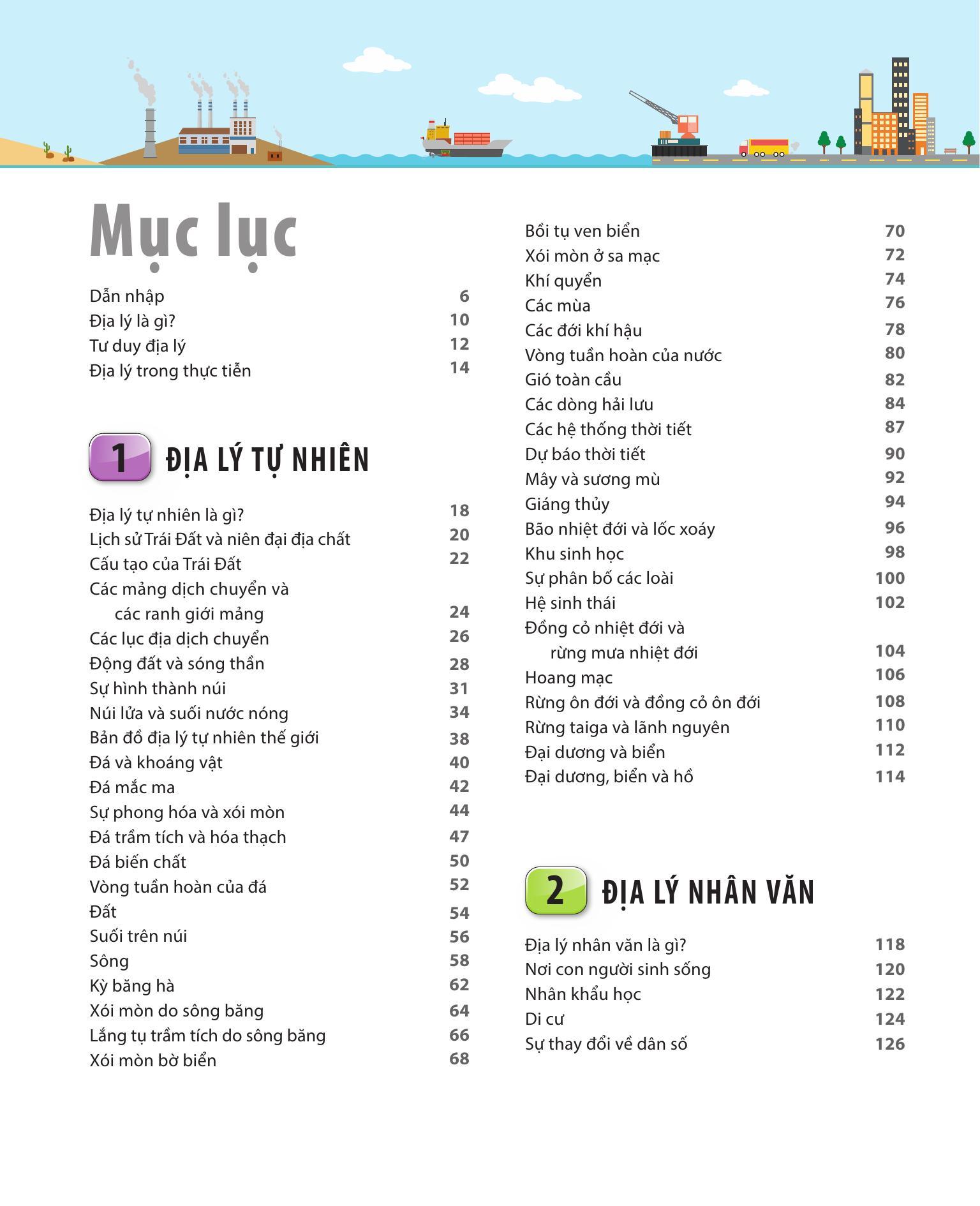 - mở rộng tư duy từ , môi trường đến con người và xã hội? “bách khoa thư về phát triển kỹ năng – địa lý” chính là lựa chọn hoàn hảo cho cả học sinh, phụ huynh lẫn giáo viên! với 3 chủ đề chính: địa lý tự nhiên; địa lý nhân văn; địa lý thực hành