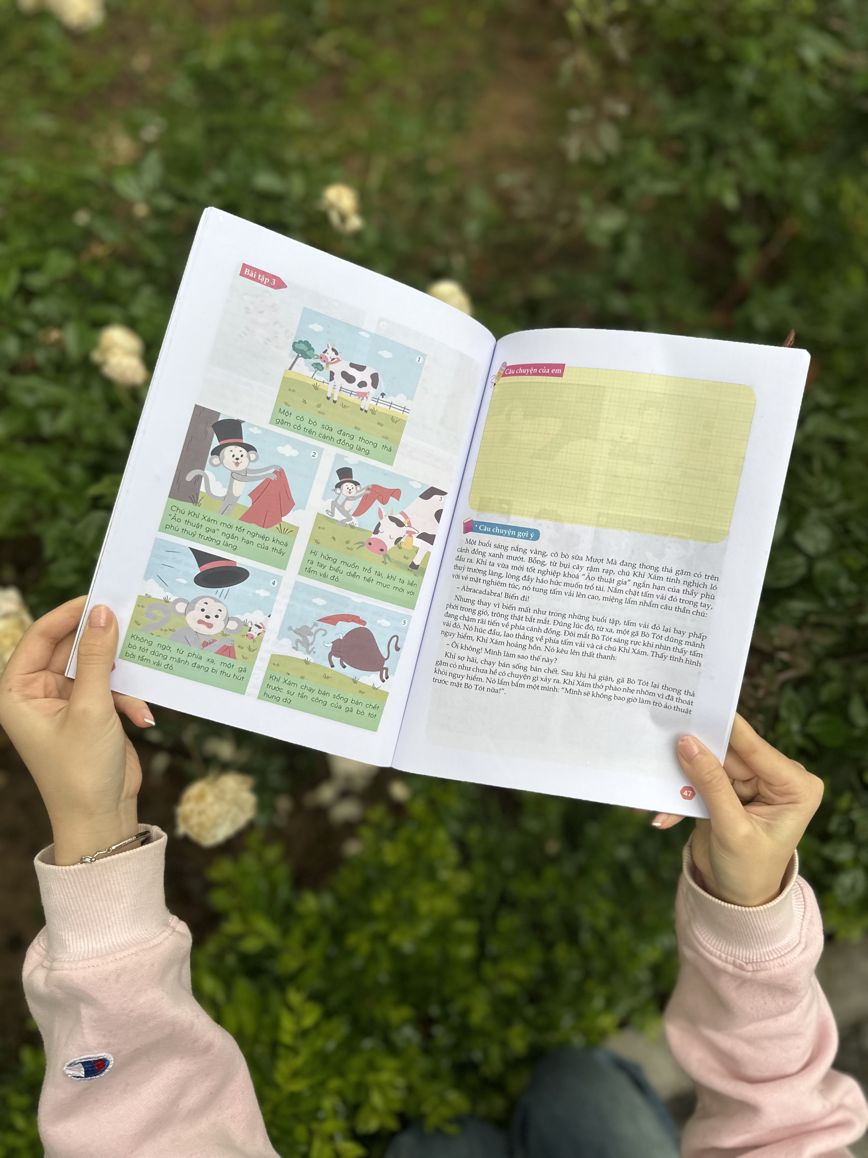 Mỗi bài tập đều được thiết kế phù hợp với lứa tuổi và khả năng nhận thức của học sinh tiểu học, để các em dễ dàng tiếp thu và áp dụng vào thực tế. Cùng với đó là phần "Câu chuyện gợi ý", cung cấp cho học sinh những câu chuyện mẫu hoặc tình huống gợi mở, có ý nghĩa quan trọng trong việc mở rộng vốn từ vựng và nâng cao khả năng diễn đạt, tạo cơ hội để các em làm quen với cách kể chuyện mạch lạc, kích thích khả năng tư duy. Thông qua đó, học sinh có thể dễ dàng hình dung và phát triển thêm các tình huống, nhân vật và cốt truyện độc đáo theo phong cách riêng của mình.