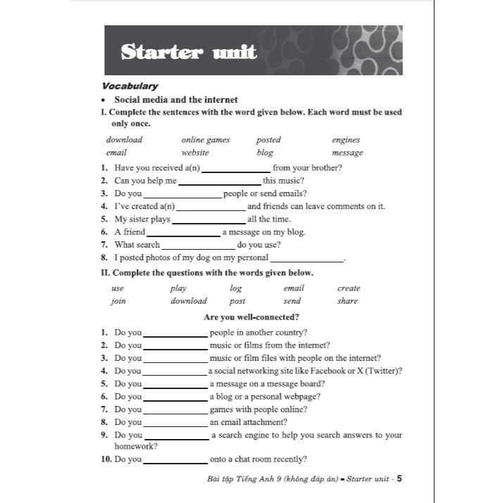 Bài tập Tiếng Anh 9 – Không đáp án được biên soạn theo Chương trình Giáo dục phổ thông: Chương trình môn Tiếng Anh theo Thông tư số 32/2008/TT-BGDĐT ngày 26 tháng 12 năm 2018, và Chương trình lớp 9 mới được giảng dạy đại trà ở các trường phổ thông từ năm học 2024 – 2025.