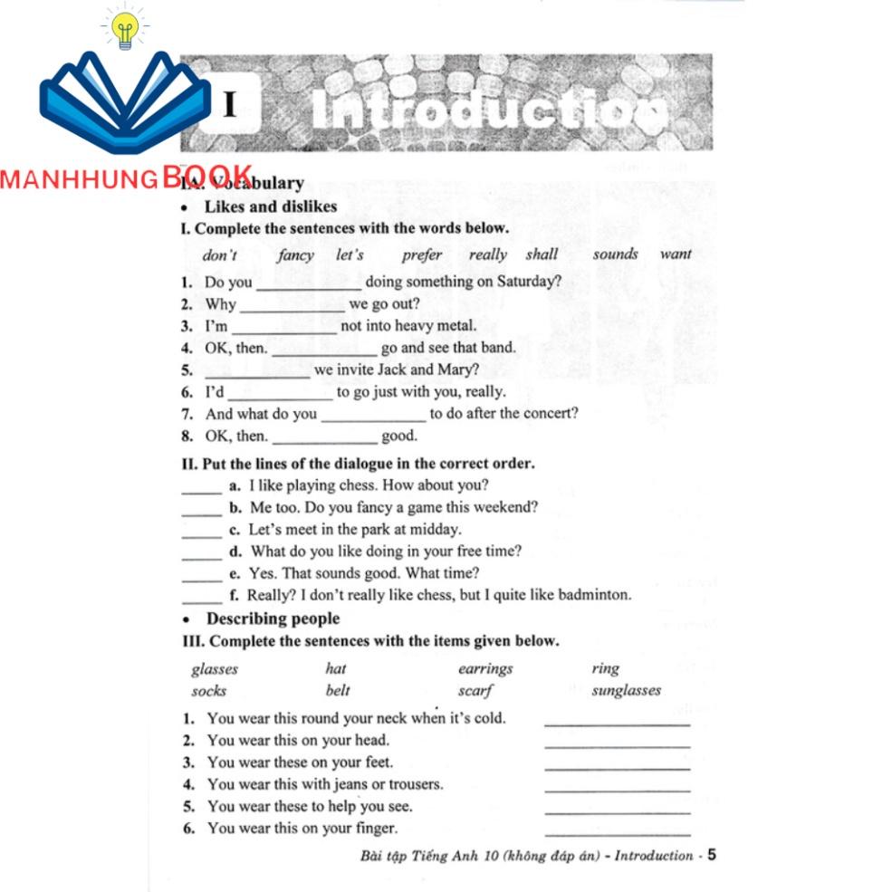 Bài Tập Tiếng Anh Lớp 10 - Không Đáp Án (Theo Chương Trình GDPT Mới) gồm một bài ôn tập củng cố kiến thức đã học (Introduction), và 8 đơn vị bài học chính: Feelings, Adventure, On screen, Our planet, Ambition, Money, Tourism, Science, và sau mỗi đơn vị bài học đều có bài ôn tập Review.