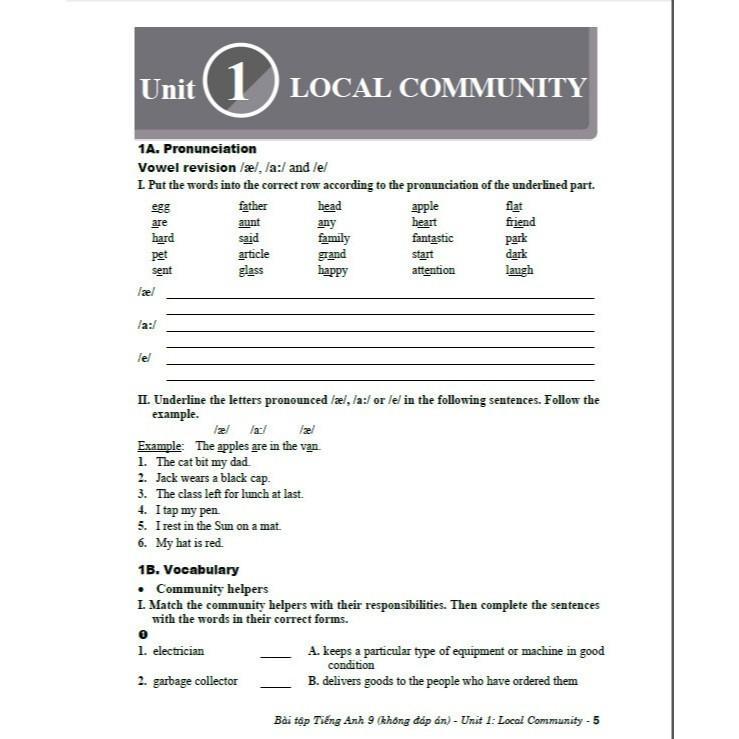 Bài tập dành cho mỗi đơn vị bài học gồm 6 phần: Pronunciation, Vocabulary, Grammar, Speaking, Reading, Writing và hai bài luyện tập Test 1 & 2 gồm 50 câu hỏi kiểm tra với bài tập phát triển các kĩ năng trên. Các bài Review giúp học sinh tự kiểm tra những nội dung kiến thức và rèn luyện các kĩ năng sau mỗi 3 đơn vị bài học.
