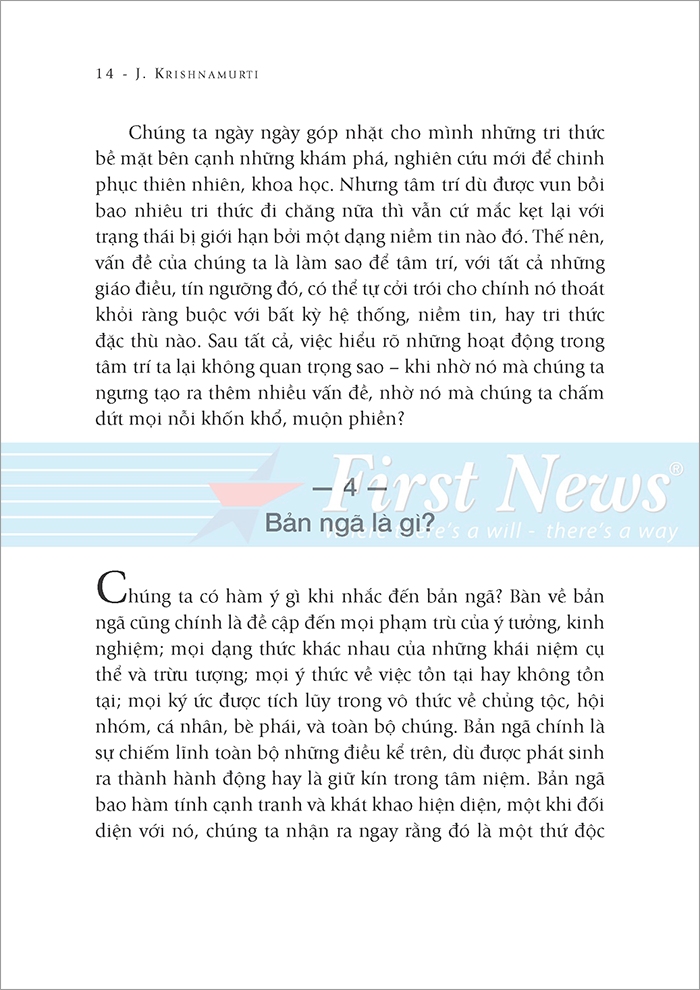 Trong phần đầu tiên của cuốn sách, Krishnamurti đề cập đến vấn đề bản ngã. Ông cho rằng bản ngã là một thứ vô hình, nhưng nó lại có sức mạnh to lớn chi phối cuộc sống của con người. Bản ngã khiến chúng ta luôn khao khát được sở hữu, được kiểm soát, và luôn muốn được người khác chấp nhận. Chính vì vậy, bản ngã là nguồn gốc của nhiều đau khổ và bất hạnh trong cuộc sống.