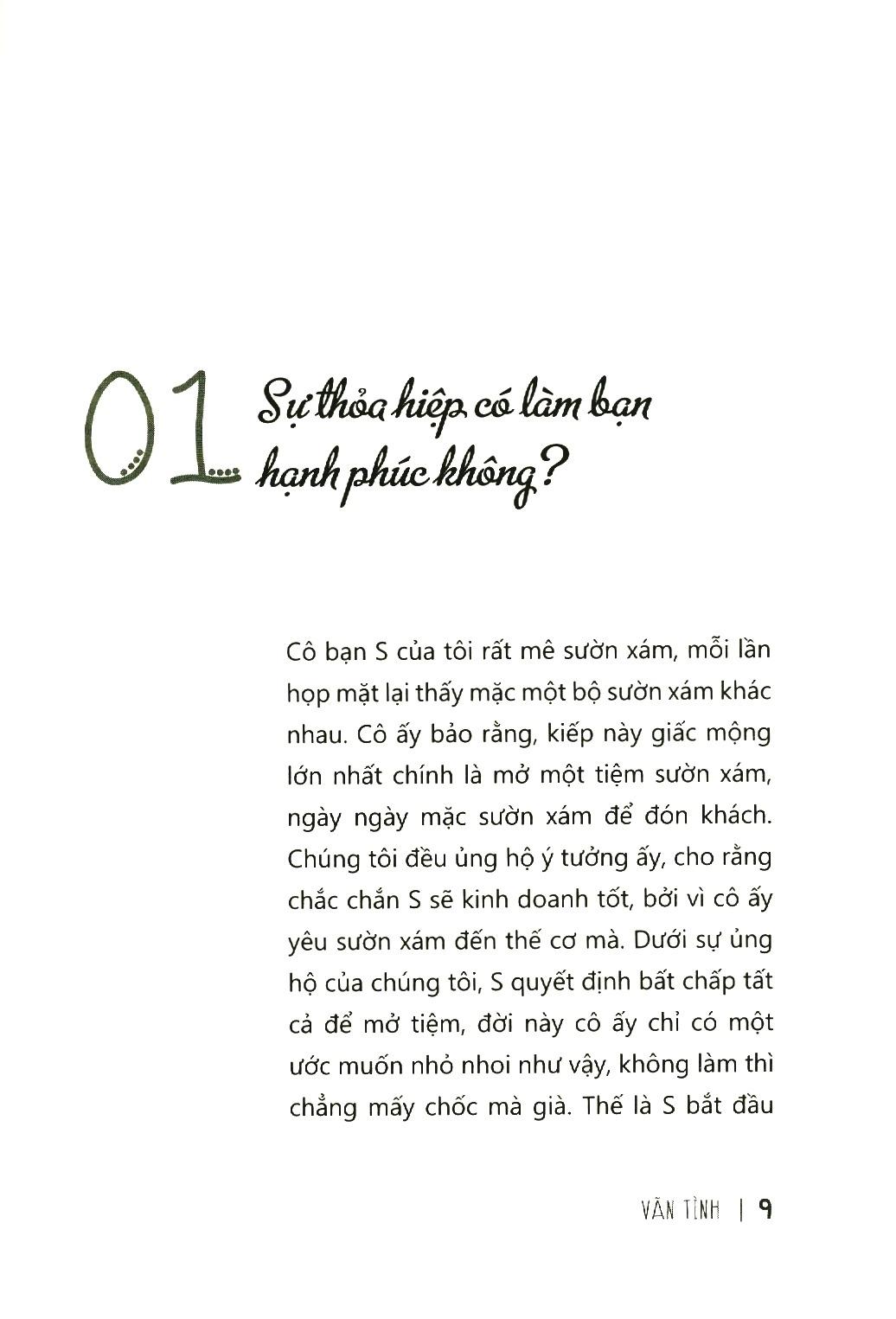 Hơn bốn mươi câu chuyện trong sách xoay quanh các chủ đề tình yêu, hôn nhân, gia đình, sự nghiệp… đến từ chính cuộc sống của tác giả và những người xung quanh, vừa thực tế lại vừa gợi mở, dễ dàng giúp chúng ta liên hệ với tình huống của chính m.ình. Với những câu chuyện đó, Vãn Tình hi vọng có thể giúp các cô gái thoát khỏi tình cảnh khó khăn, tìm lại bản ngã, sống cuộc đời theo cách mà m.ình mong muốn.