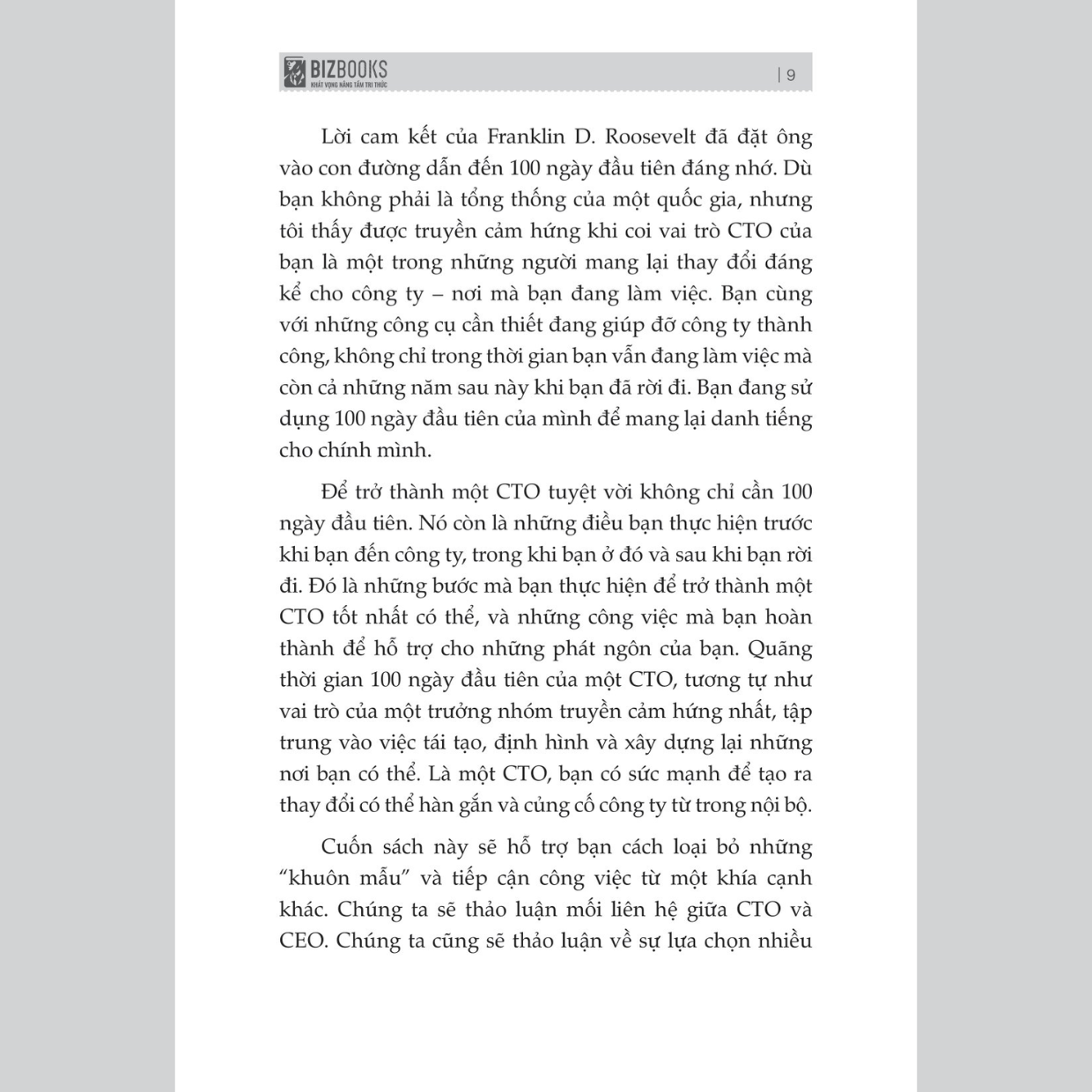 Một CTO được kỳ vọng là người có các kỹ năng mềm và kỹ năng cứng vượt trội, cùng khả năng nắm bắt khoa học công nghệ thông tin xuất sắc. Bạn đã sẵn sàng để trở thành một CTO? – Một người tiên phong công nghệ trong tất cả các khía cạnh của doanh nghiệp, cân bằng nhu cầu của nhân viên, người dùng (hay khách hàng) và các bên liên quan có chung lợi ích. Bizbooks hy vọng bạn sẽ trở thành một CTO xuất sắc, tất cả những người làm việc với bạn đều sẽ được truyền cảm hứng làm việc tích cực hơn.