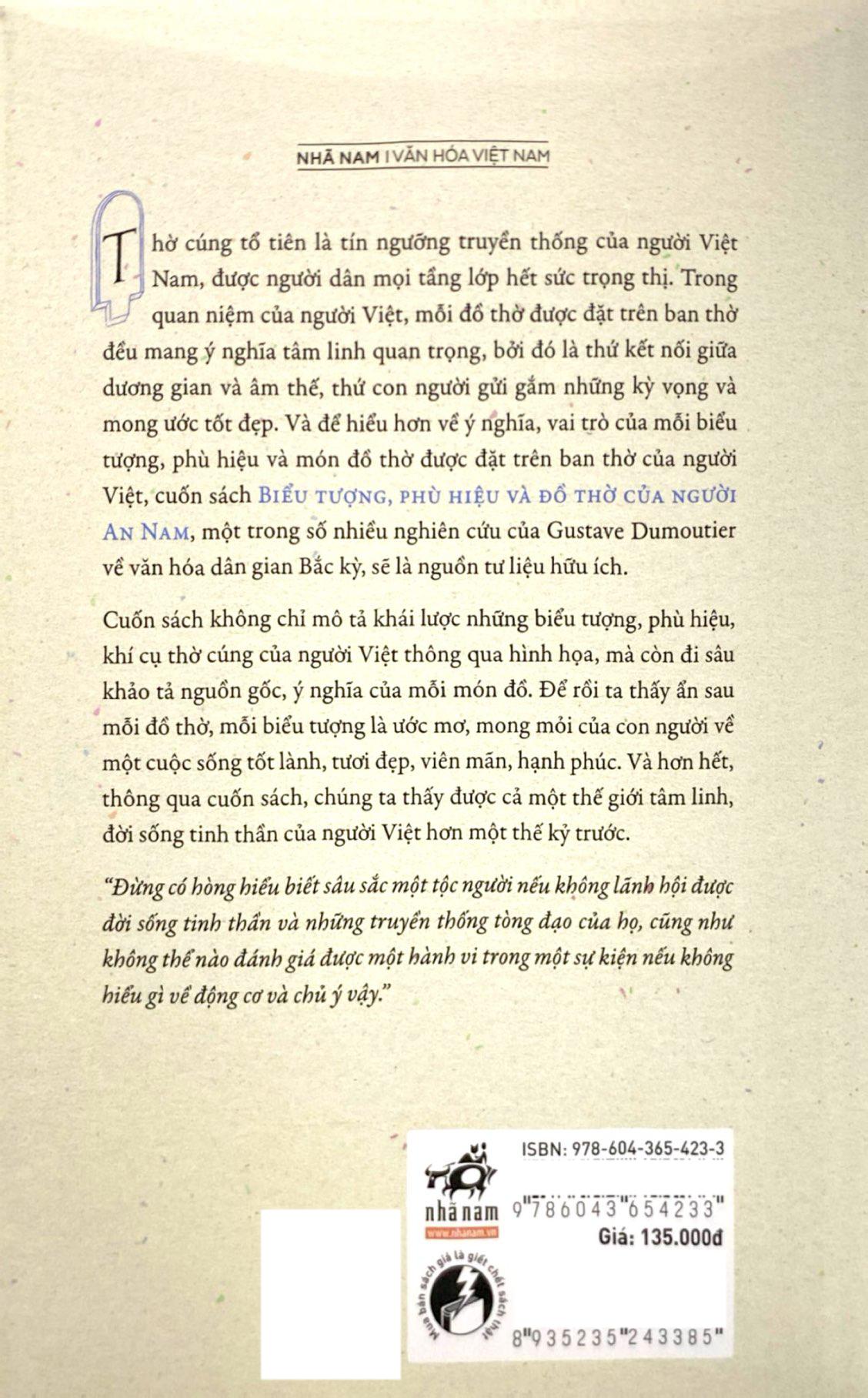 Thờ cúng tổ tiên là tín ngưỡng truyền thống của người Việt Nam, được người dân mọi tầng lớp hết sức trọng thị. Trong quan niệm của người Việt, mỗi đồ thờ được đặt trên ban thờ đều mang ý nghĩa tâm linh quan trọng, bởi đó là thứ kết nối giữa dương gian và âm thế, thứ con người gửi gắm những kỳ vọng và mong ước tốt đẹp. Và để hiểu hơn về ý nghĩa, vai trò của mỗi biểu tượng, phù hiệu và món đồ thờ được đặt trên ban thờ của người Việt, cuốn sách BIỂU TƯỢNG, PHÙ HIỆU VÀ ĐỒ THỜ CỦA NGƯỜI AN NAM, một trong số nhiều nghiên cứu của Gustave Dumoutier về văn hóa dân gian Bắc kỳ, sẽ là nguồn tư liệu hữu ích.