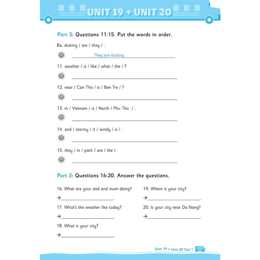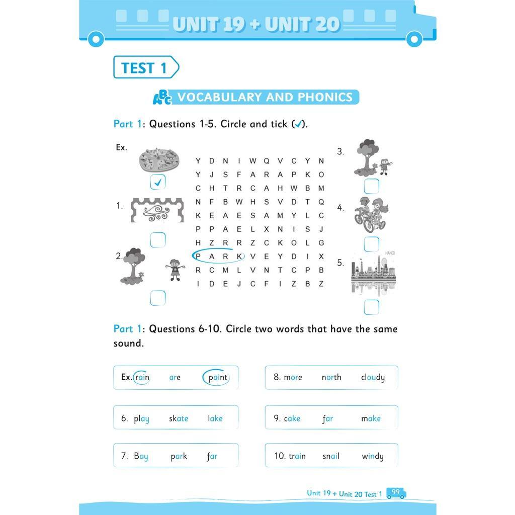 Cứ hai bài sẽ có 2 bài kiểm tra, tất cả các bài kiểm tra đều được thiết kế theo quy định thông tư mới nhất về kiểm tra môn Tiếng Anh tiểu học.