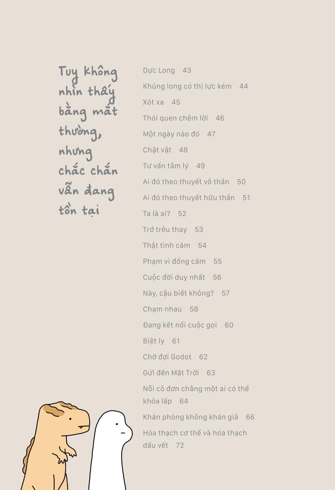 Mua tại TiktokBình Thản Tĩnh Lặng, Dũng Cảm Cô Đơn Con khủng long cuối cùng còn sót lại trên Trái Đất đã cảm thấy thế nào nhỉ? Nó cảm thấy như m.ình có cả thế giới hay là cảm thấy như bị thế giới bỏ rơi? Nó vô cùng cô đơn hay đang sống dũng cảm ở một khoảng cách thích hợp với những sinh vật không phải khủng long? Bạn biết không, nếu có một ngày Trái Đất chỉ còn lại mỗi m.ình bạn, có lẽ bạn lại nhận ra rằng từ trước đến giờ m.ình chưa từng cô đơn. Vậy nên trong thời đại mà con người đang kết nối quá mức với nhau này, nếu bạn thích ở một m.ình thì cũng chẳng sao cả, cứ bình thản mà tĩnh lặng, dũng cảm mà cô đơn...