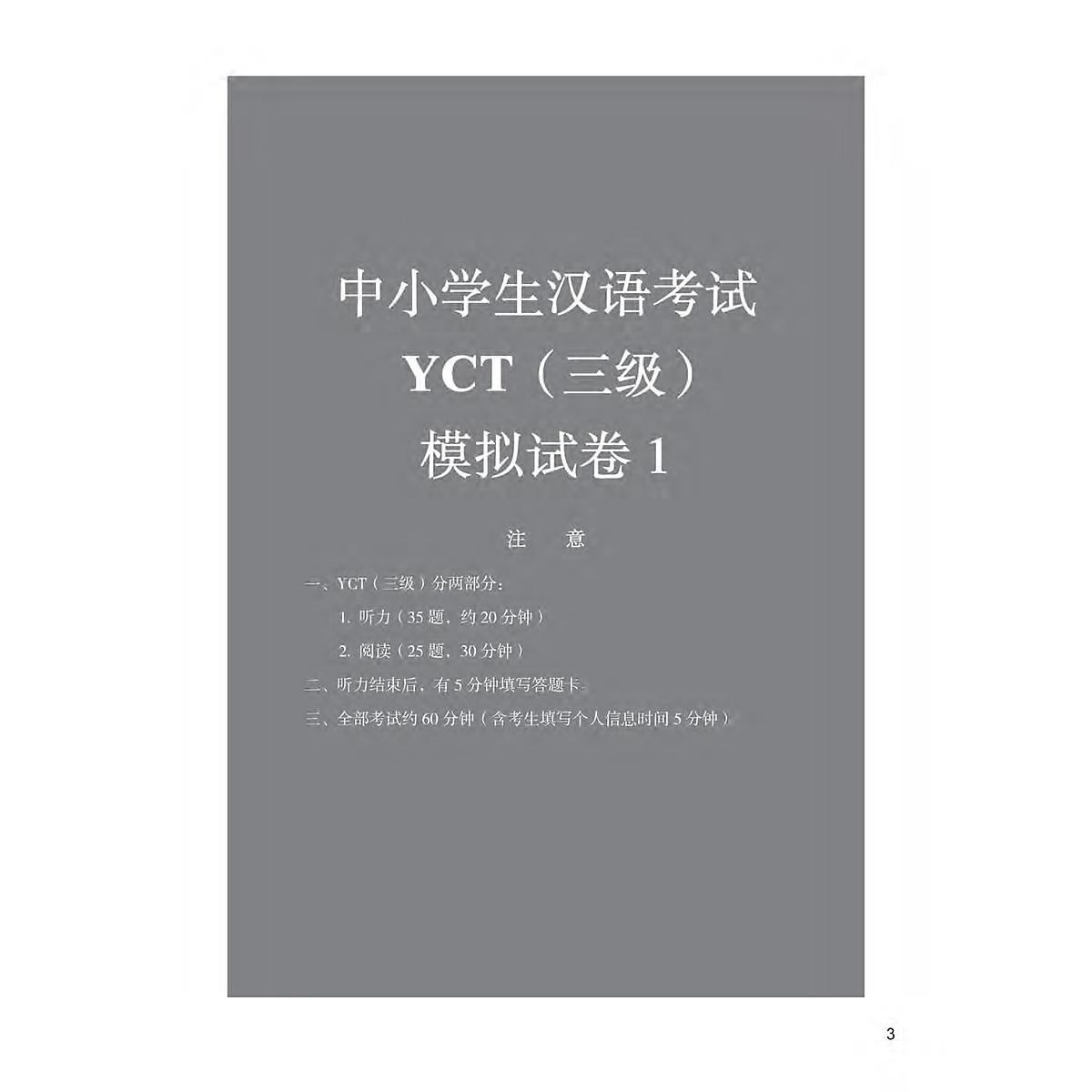Giới thiệu Kỳ thi tiếng Trung dành cho học sinh (Youth Chinese Test – YCT) là kỳ thi chuẩn ở phạm vi quốc tế nhằm đánh giá khả năng sử dụng tiếng Trung trong cuộc sống hằng ngày cũng như trong học tập của học sinh tiểu học và trung học cơ sở có tiếng mẹ đẻ không phải là tiếng Trung. Bộ đề thi mô phỏng YCT gồm bốn quyển (tương ứng với các cấp độ từ 1 đến 4 của kỳ thi YCT), được biên soạn trên cơ sở bám sát những câu hỏi trong các đề thi YCT gần đây nhằm giúp học sinh ôn thi hiệu quả cũng như tự đánh giá trình độ của bản thân.