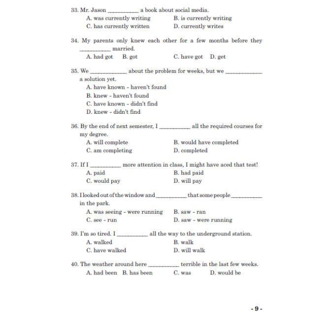 lời đúng, viết câu hoàn chỉnh từ các từ và cụm từ cho trước, lựa chọn câu đối thoại phù hợp, nhằm bồi dưỡng thêm cho các em về kĩ năng đọc hiểu, nói và viết. Ngoài ra, sách có phần Key (đáp án tham khảo) nhằm giúp cho học sinh dễ làm bài hiệu quả. Bằng việc siêng năng luyện tập các dạng bài tập trong quyển sách này, cùng với sự tiếp thu kiến thức ở trường lớp, chắc chắn các em sẽ không những nắm vững kiến thức Tiếng Anh lớp 9 mà còn nhanh chóng tiến bộ để trở thành học sinh giỏi môn Tiếng Anh và đạt kết quả cao trong các kì thi học sinh giỏi.