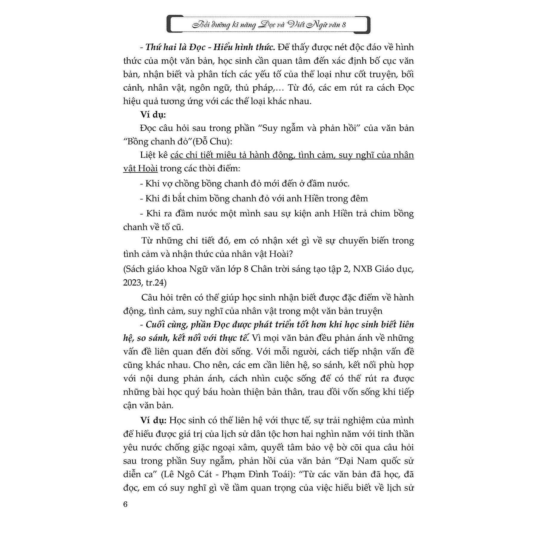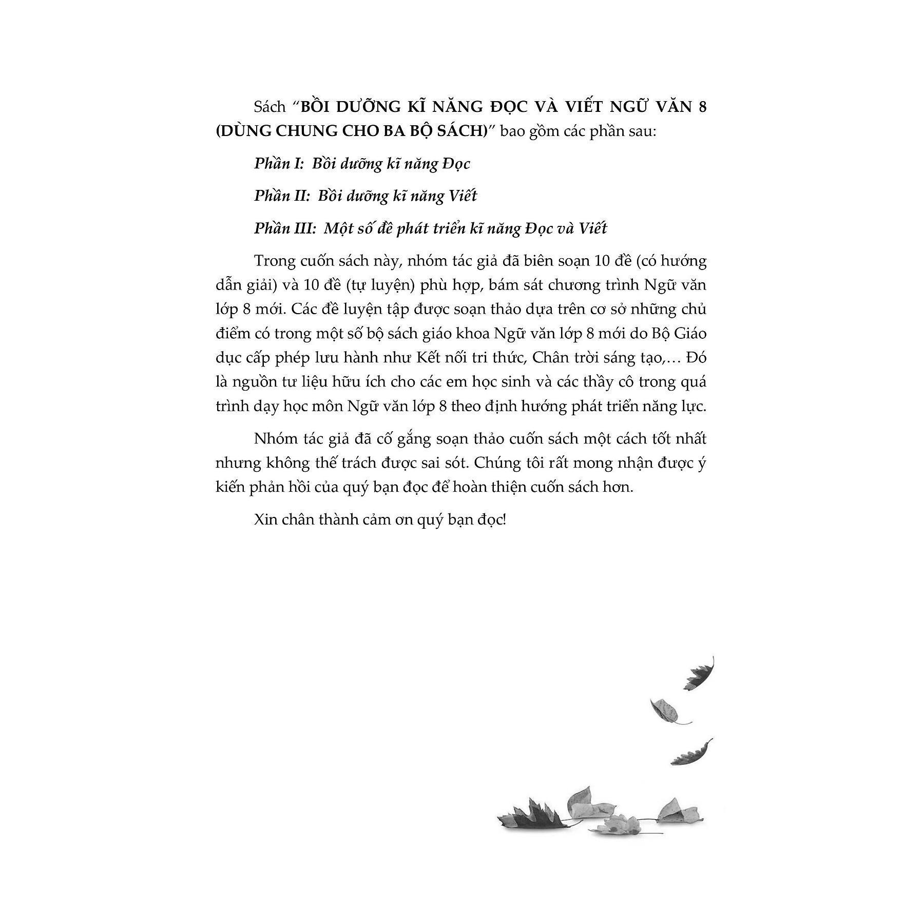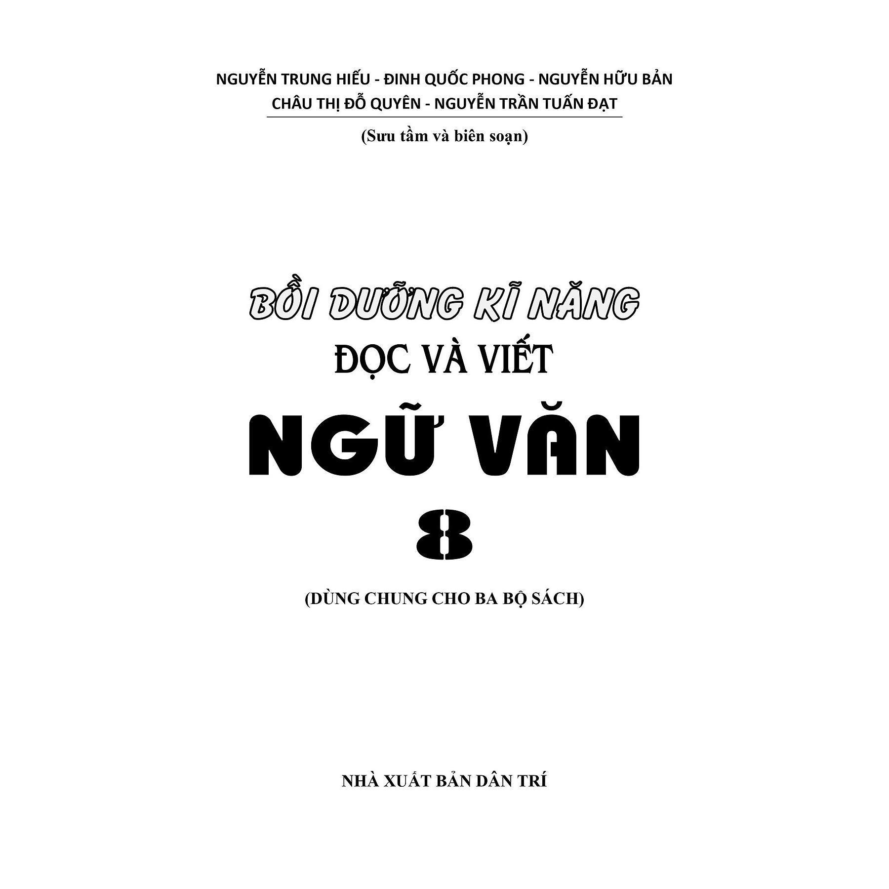 Cuốn sách “BỒI DƯỠNG KĨ NĂNG ĐỌC VÀ VIẾT NGỮ VĂN 8” sẽ giúp học sinh rèn luyện, phát triển kĩ nǎng Đọc, Viết, định hướng cách làm bài hiệu quả, phù hợp. Các em dễ tiếp cận, nắm được cách làm bài tập Đọc, Viết trong chường trình Ngữ vǎn lớp 8 mới, cải thiện, phát triển tư duy ngôn ngữ qua việc tự rèn luyện hai kĩ nǎng quan trọng (đọc, viết) khi học môn Ngữ vǎn. Thông qua mỗi đề luyện tập, học sinh có thể mở rộng vốn hiểu biết của bản thân về những vấn đề trong cuộc sống liên quan đến các chủ đề, bồi đắp tình yêu quê hương, đất nước nói chung, vǎn chương nói riêng đồng thời biết giữ gìn, phát huy giá trị của tiếng Việt đối với đời sống hiện nay. Cuốn sách “BỒI DƯỠNG KĨ NĂNG ĐỌC VÀ VIẾT NGỮ VĂN 8” còn là nguồn tài liệu bổ ích để các thầy cô có thể tham khảo, hướng dẫn học sinh rèn luyện kĩ nǎng Đọc và Viết thật hiệu quả.