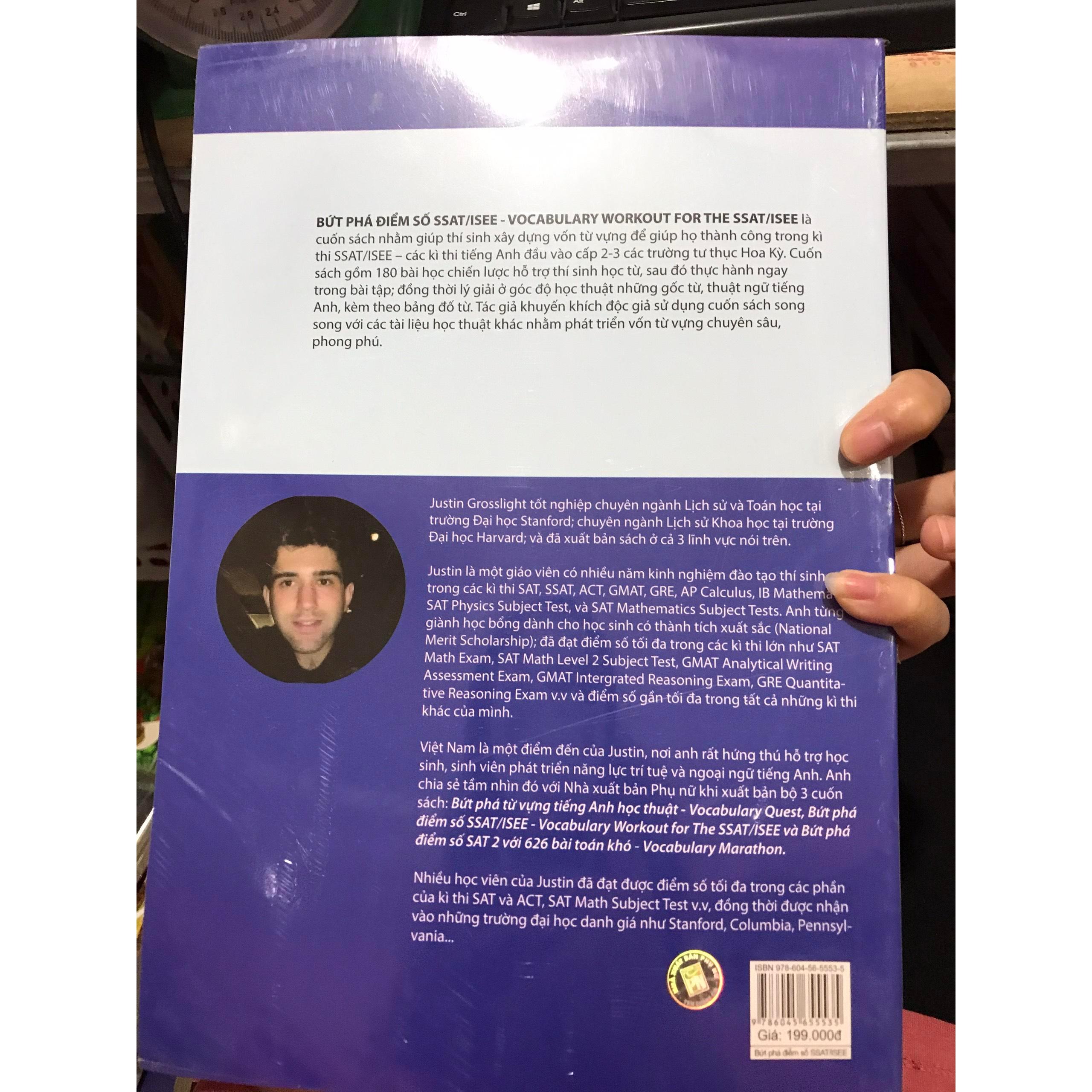 Bứt Phá Điểm Số SSAT/ISEE Bứt Phá Điểm Số Ssat/Isee - Vocabulary Workout For The Ssat/Isee là cuốn sách nhằm giúp thí sinh xây dựng vốn từ vựng để giúp họ thành công trong kì thi SSAT/ISEE – các kì thi tiếng Anh đầu vào các trường cấp 2-3 tư thục Hoa Kỳ. Cuốn sách gồm 180 bài học chiến lược hỗ trợ thí sinh học từ, sau đó thực hành ngay trong bài tập; đồng thời lý giải ở góc độ học thuật những gốc từ, thuật ngữ tiếng Anh, kèm theo bảng đố từ. Tác giả khuyến khích độc giả sử dụng cuốn sách song song với các tài liệu học thuật khác nhằm phát triển vốn từ vựng chuyên sâu, phong phú.