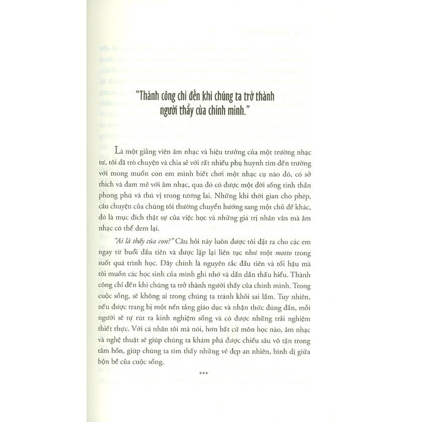 Cuốn sách được viết qua ngòi bút của một người là học trò cũ và một người là con gái ruột của thầy K. Với những góc nhìn khác biệt mà tương đồng và thấu hiểu về người thầy đáng kính trọng, họ chia sẻ về những kinh nghiệm mà họ đã có được qua quá trình học nhạc kiên trì và bền bỉ. Điều này không chỉ giúp họ rèn luyện được kỹ năng mà còn khiến họ trưởng thành hơn trong cuộc sống hiện tại."