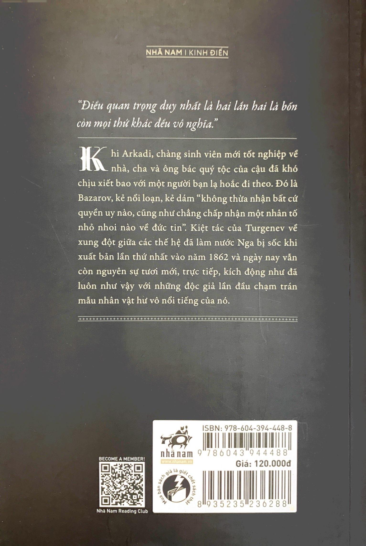Khi Arkadi, chàng sinh viên mới tốt nghiệp về nhà, cha và ông bác quý tộc của cậu đã khó chịu xiết bao với một người bạn lạ hoắc đi theo. Đó là Bazarov, kẻ nổi loạn, kẻ dám “không thừa nhận bất cứ quyền uy nào, cũng như chẳng chấp nhận một nhân tố nhỏ nhoi nào về đức tin”. Kiệt tác của Turgenev về xung đột giữa các thế hệ đã làm nước Nga bị sốc khi xuất bản lần thứ nhất vào năm 1862 và ngày nay vẫn còn nguyên sự tươi mới, trực tiếp, kích động như đã luôn như vậy với những độc giả lần đầu chạm trán mẫu nhân vật hư vô nổi tiếng của nó.