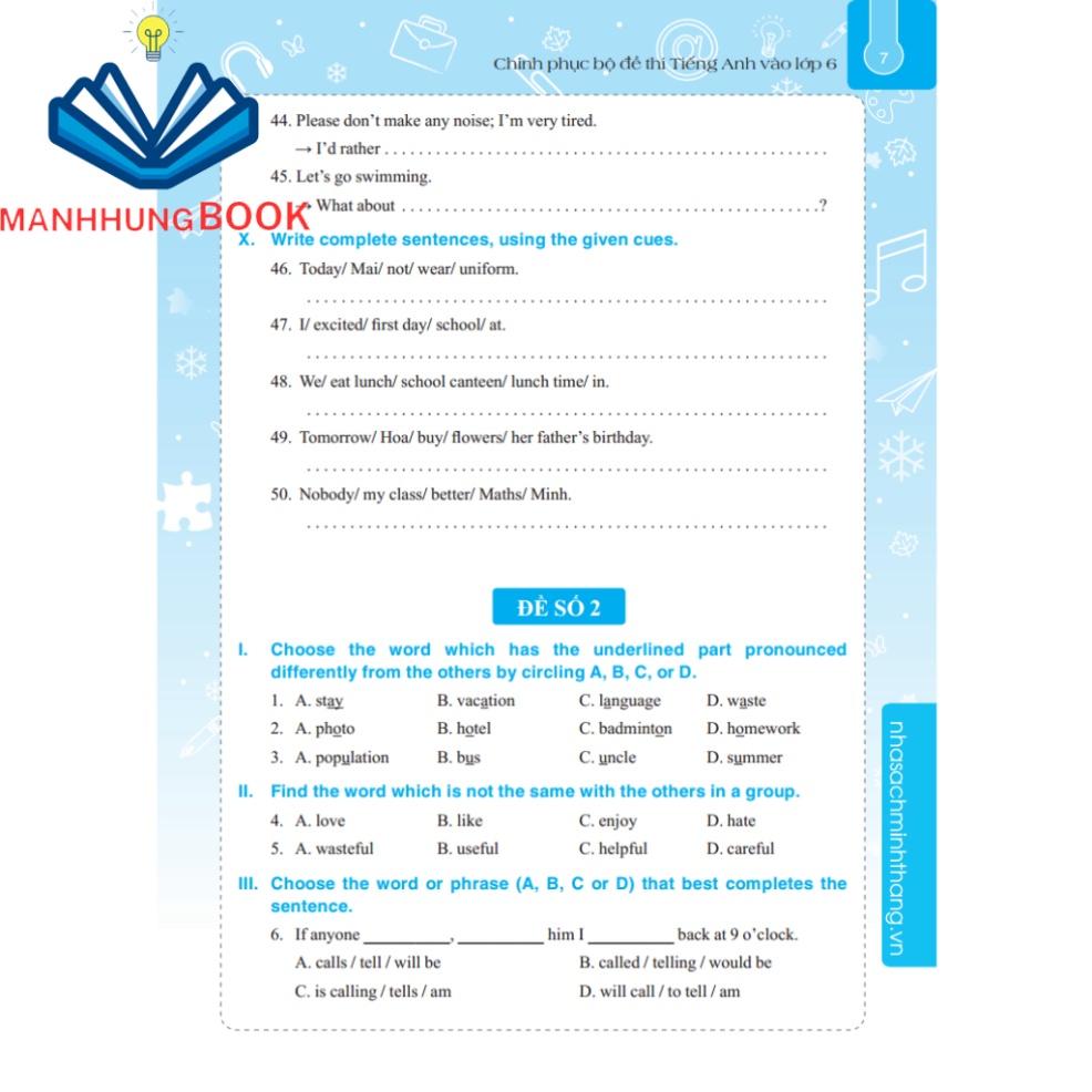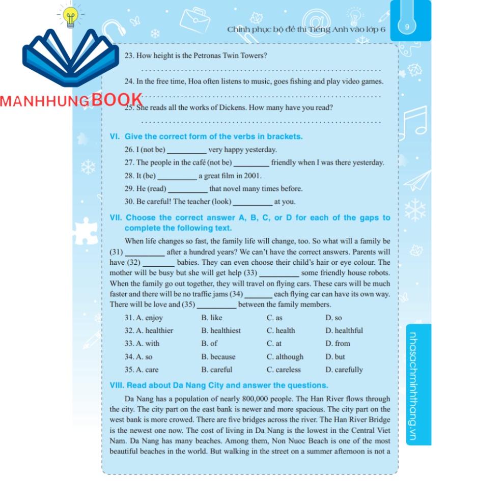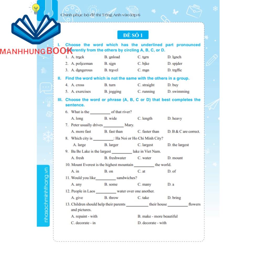 Cuốn “Chinh phục bộ đề thi Tiếng Anh vào lớp 6” lần này sẽ là cẩm nang giúp các em rút ngắn khoảng cách và những hạn chế trong hiểu biết của mình để đến với những đề thi vào lớp 6, thi vào các trường huyên, lớp Chọn sát với đề thi chính thức.