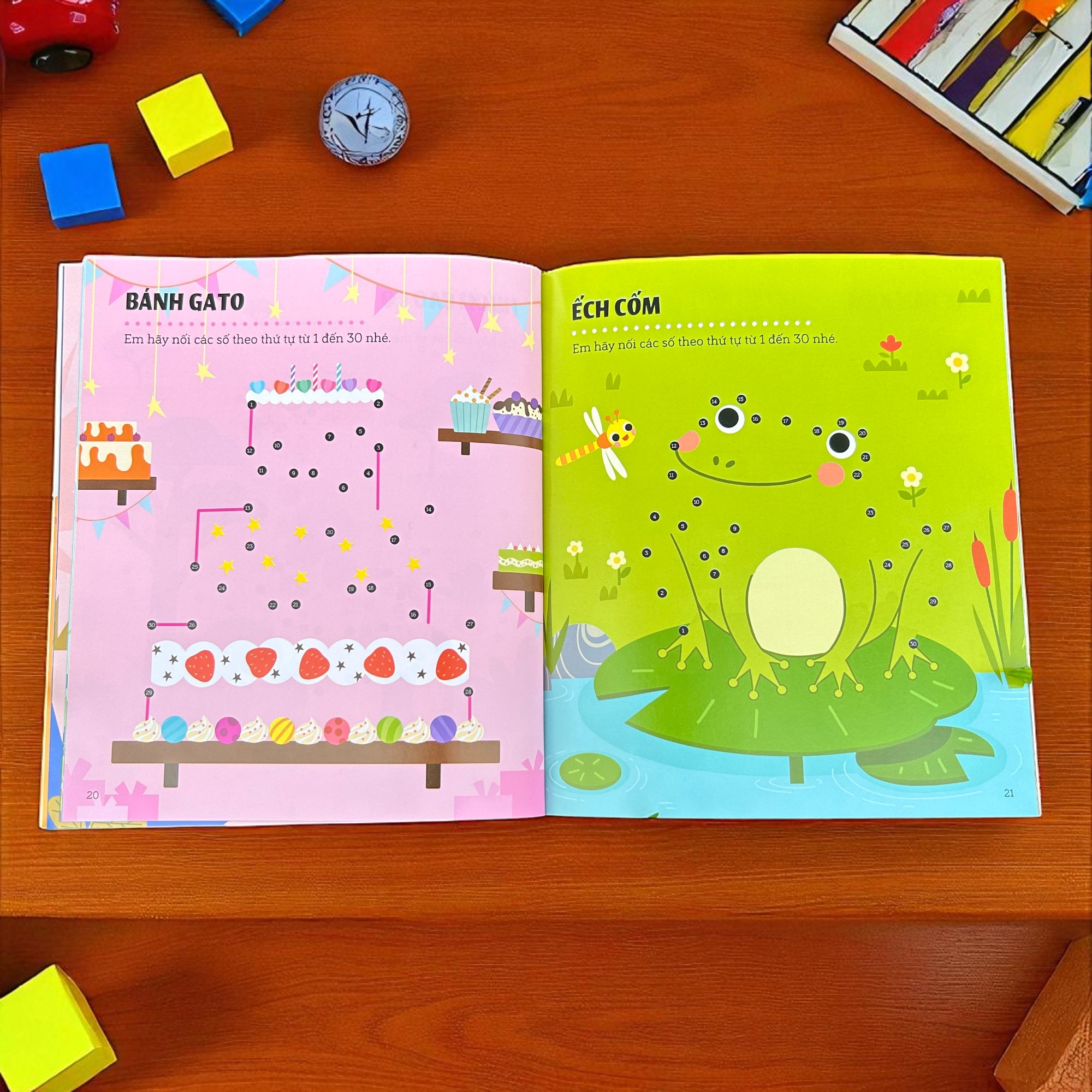 Cuốn sách được chia thành nhiều thử thách tăng dần từ đơn giản đến nâng cao: Nối số từ 1–10: Phù hợp cho các bé mới làm quen với con số, giúp nhận biết trình tự và rèn kỹ năng cầm bút, quan sát; Nối số từ 1–20, 1–30: Tăng mức độ tập trung, luyện trí nhớ, khả năng đếm và nhận diện số; Nối số từ 1–50 và lên tới 100: Với các hình ảnh phức tạp hơn như khủng long, tàu thủy, ông già Noel, khu vui chơi, căn nhà kẹo ngọt, rạp xiếc… giúp trẻ tập trung cao độ trong thời gian dài, luyện kiên trì và sự hoàn thiện.