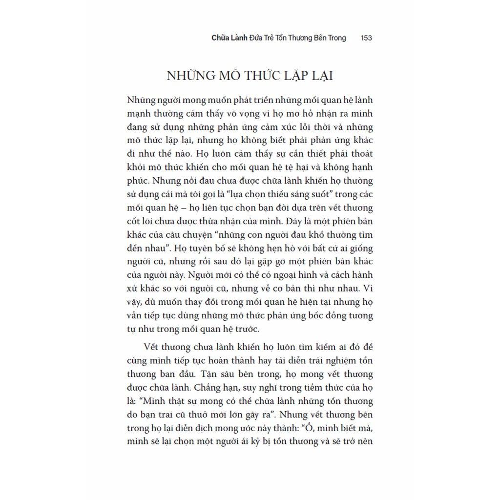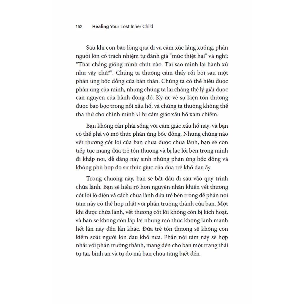 Thông qua các bài tập và câu chuyện của những người đã được chữa lành cũng như của chính tác giả, cuốn sách hướng dẫn làm thế nào để thấu hiểu “đứa trẻ tổn thương” bên trong chính mình và cách để kết nối phần nội tâm này với “phần trưởng thành”. Chẳng hạn như nhìn lại dòng sự kiện thời thơ ấu, viết thư trao đổi giữa phần trưởng thành và phần tổn thương, liên hệ những phản ứng bốc đồng trong hiện tại với nguyên nhân trong quá khứ… Việc viết những lá thư chữa lành qua lại với chính mình là một cách tuyệt vời để nhanh chóng làm bộc lộ những cảm xúc và kết nối với phần tổn thương bên trong bạn. Bạn đọc cũng sẽ hiểu cách mà “phần người lớn có trách nhiệm” có thể phát triển một bộ công cụ hồi đáp mới, tích cực hơn, thay thế cho những kiểu phản ứng cũ của đứa trẻ tổn thương bên trong.