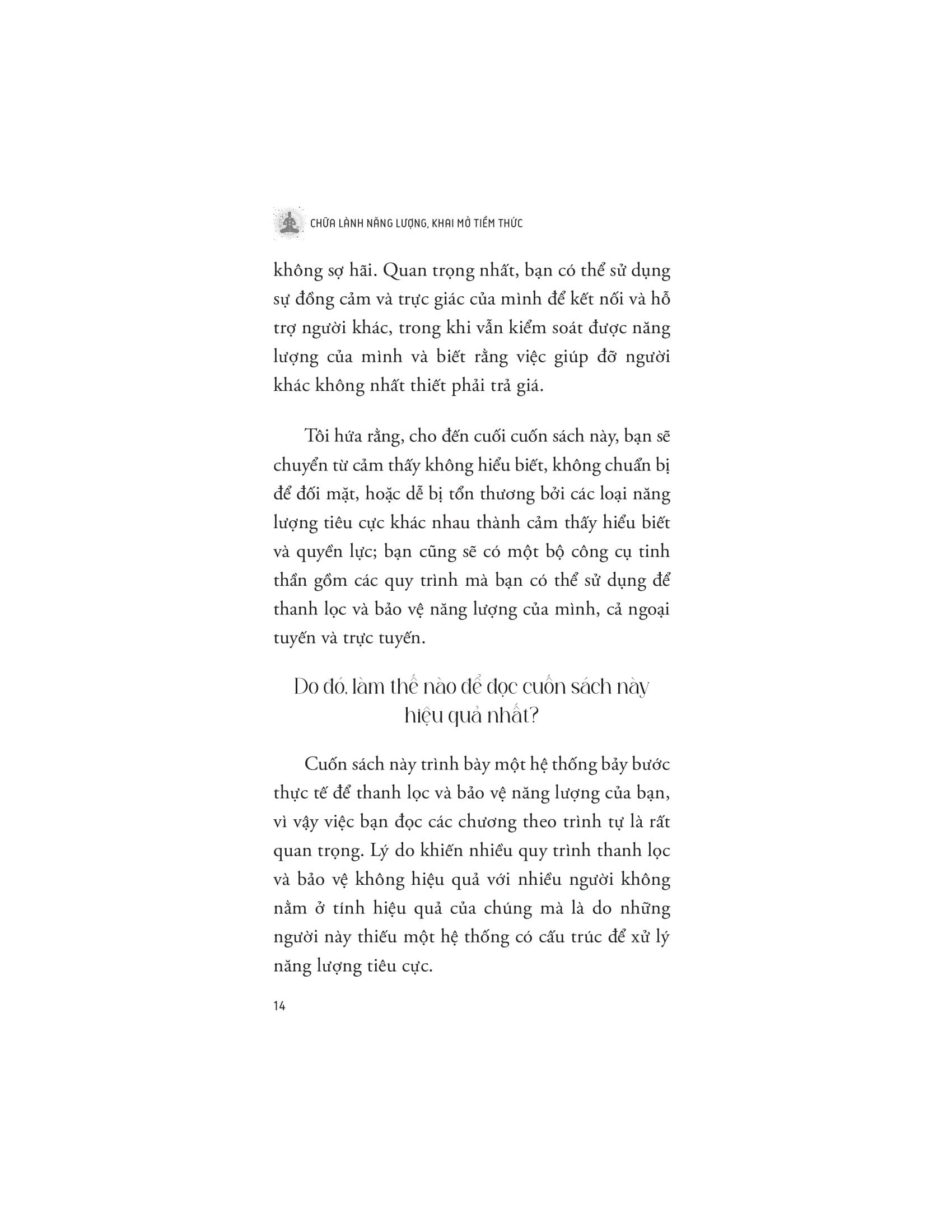 Tác giả George Lizos định nghĩa bảo vệ năng lượng là nghệ thuật duy trì suy nghĩ, cảm xúc và hành vi không bị tác động bởi môi trường xung quanh. Sách giới thiệu cách thiết lập ranh giới năng lượng rõ ràng, quản lý tương tác để giữ vững tính xác thực cá nhân. Qua đó bạn sẽ học được cách: