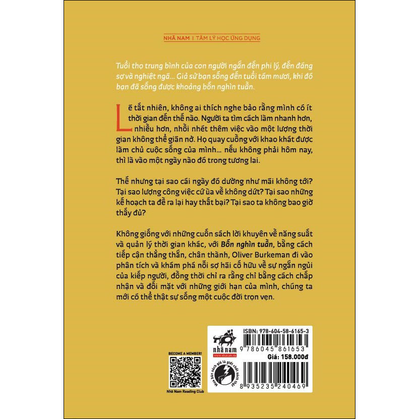 Không giống với những cuốn sách lời khuyên về năng suất và quản lý thời gian khác, với Bốn nghìn tuần, bằng cách tiếp cận thẳng thắn, chân thành, tác giả Oliver Burkeman đi vào phân tích và khám phá nỗi sợ hãi cố hữu về sự ngắn ngủi của kiếp người, đồng thời chỉ ra rằng chỉ bằng cách chấp nhận và đối mặt với những giới hạn của mình, chúng ta mới có thể thật sự sống một cuộc đời trọn vẹn.