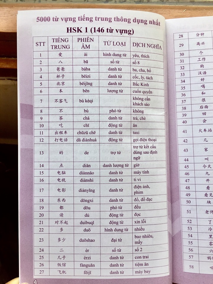1.5000 từ vựng tiếng Trung thông dụng nhất Nội dung sách: “Sách – 5000 từ vựng tiếng Trung thông dụng nhất” theo khung đề thi từ HSK1 – 6 cung cấp đầy đủ lượng từ vựng cần thiết giúp việc học từ vựng tiện lợi và hiệu quả hơn, đồng thời hỗ trợ cho việc thi các cấp độ HSK từ 1 đến 6 Tác giả: Trần Thị Tú Oanh Số trang: 184 Năm xuất bản: 2019 Nhà xuất bản: Đà Nẵng Chú ý : Nội dung trong sách tổng 5000 từ HSK1 (146 trang 4) HSK2(149 Trang 9) HSK3(303 từ trang 14) HSK4(606 từ trang 24) HSK5 (1296 từ trang 45) HSK6(2500 từ trang 88) Nhằm đáp ứng nhu cầu học từ vựng của bạn đọc, chúng tôi xin giới thiệu cuốn sách 5000 từ vựng tiếng Trung – Bí kíp chinh phục từ vựng kỳ thi HSK 1 – 6 tổng hợp những từ vựng tếng Trung được sử dụng với tần suất nhiều nhất trong các kỳ thi HSK. Ngoài việc liệt kê những từ vựng thông dụng, chúng tôi còn đưa ra cách phát âm, âm Hán Việt, nghĩa để các bạn có thể hiểu rõ và sử dụng đúng từ vựng vừa học, từ đó giúp các bạn nâng cao vốn từ vựng và nâng cao khả năng tiếng Trung, đặc biệt là đạt kết quả tốt trong các kỳ thi HSK. Để có thể thi được HSK, bạn phải có 1 vốn từ vựng phù hợp. HSK càng cao thì lượng từ vựng cũng càng yêu cầu mở rộng hơn. Cụ thể: Hán ngữ 1: học hết lượng từ vựng trong giáo trình hán ngữ 1 (150 từ). Hán ngữ 2: học hết lượng từ vựng trong giáo trình hán ngữ 1+2 (300 từ). Hán ngữ 3: học hết lượng từ vựng trong giáo trình hán ngữ 1+2+3 (600 từ). Hán ngữ 4: học hết lượng từ vựng trong giáo trình hán ngữ 1+2+3+4 (1200 từ). Hán ngữ 5: học hết lượng từ vựng trong giáo trình hán ngữ 1+2+3+4+5 (2500 từ). Hán ngữ 6: học hết lượng từ vựng trong giáo trình hán ngữ 1+2+3+4+5+6 (5000 từ).