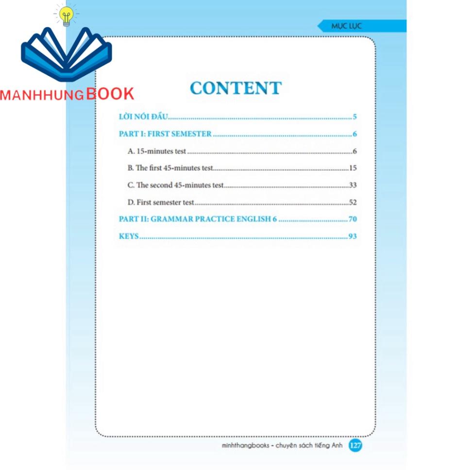 Nội dung cuốn sách hoàn toàn bám sát chương trình SGK và được thể hiện dưới các đề kiểm tra trắc nghiệm và tự luận. Thông qua việc làm các bài kiểm tra, các em học sinh có thể xác định mức độ hiểu bài và các kỹ năng cần phải củng cố thêm. Bộ đề kiểm tra tiếng Anh lớp 6 gồm 2 tập.