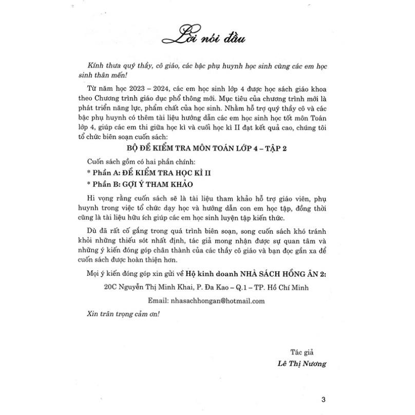 - Phần B: GỢI Ý THAM KHẢO Hi vọng rằng cuốn sách Bộ đề kiểm tra môn Tiếng Việt lớp 4 sẽ là tài liệu tham khảo hỗ trợ giáo viên, phụ huynh dạy tốt cho học sinh và cũng là tài liệu học tập hữu ích dành cho các em học sinh. Dù tác giả đã rất cố gắng trong quá trình biên soạn, song cuốn sách khó tránh khỏi những thiếu sót nhất định. Tác giả mong nhận được sự quan tâm và những ý kiến đóng góp chân thành của các thầy cô