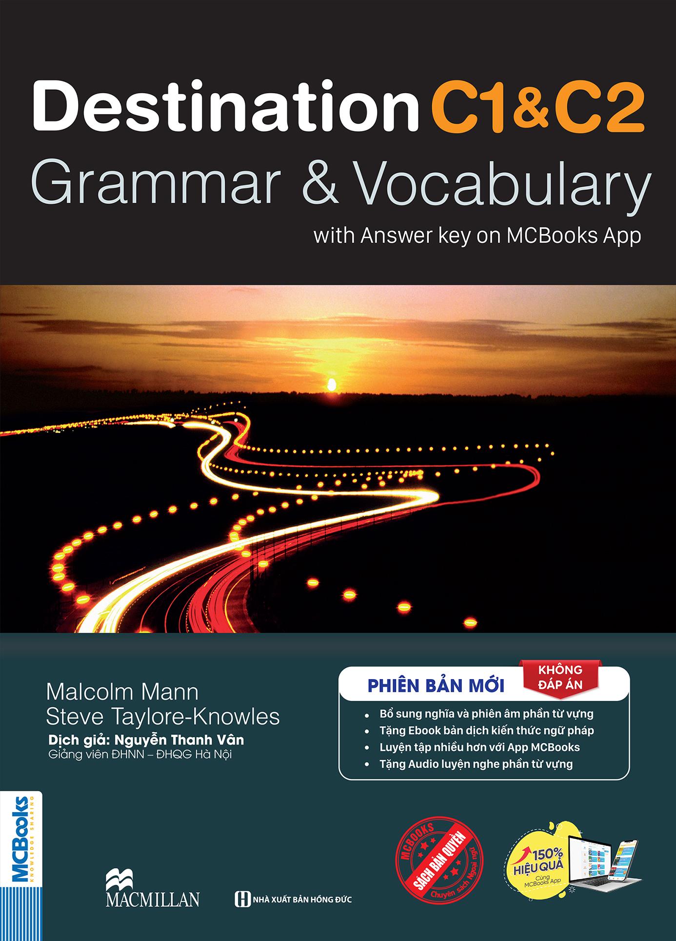 - Destination C1&C2 - Grammar And Vocabulary With Answer Key (Không Đáp Án) Giới thiệu cuốn sách Destination C1 & C2 Chứng chỉ tiếng Anh C1, C2 hiện nay là những chứng chỉ nhất định phải có đối với một số đơn vị, cơ quan, trường học. Chính vì vậy, ngày càng nhiều người quan tâm tới việc trau dồi tiếng Anh và xây dựng lộ trình học để đạt được mục tiêu tiếng Anh của m.ình. Bộ sách cung cấp từ vựng và ngữ pháp tiếng Anh cần thiết nhất dành cho người học đang có ý định thi các kỳ thi ở Level C1 & C2 theo khung tham chiếu châu Âu và mong muốn cải thiện năng lực tiếng Anh của bản thân. Toàn bộ kiến thức trong sách được viết bằng tiếng Anh bao gồm 42 Unit. Trong đó, cứ hai Unit học về ngữ pháp thì có một Unit học về từ vựng theo chủ đề. Nội dung cuốn sách