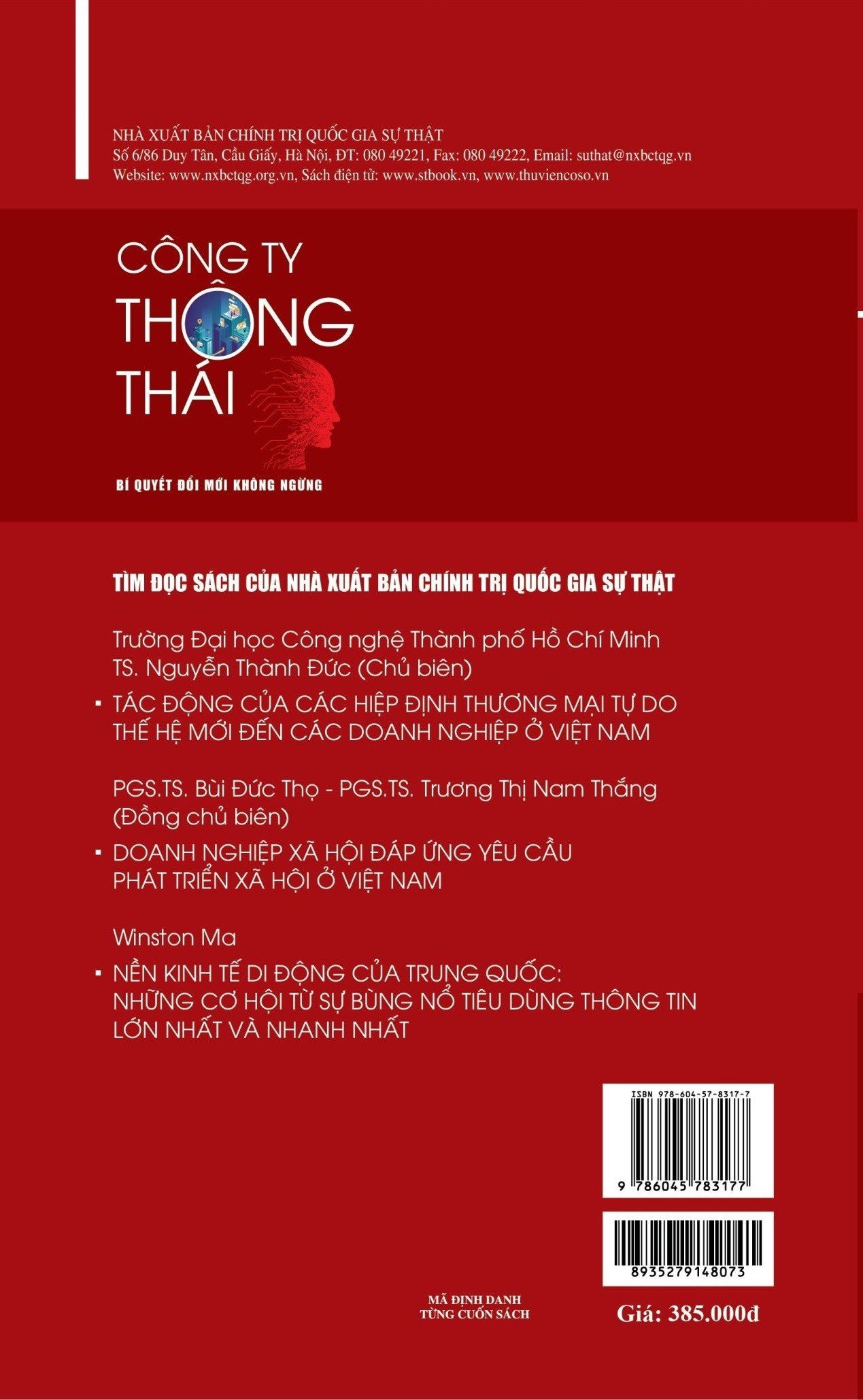 SÁCH CÔNG TY THÔNG THÁI - BÍ QUYẾT ĐỔI MỚI KHÔNG NGỪNG Tác giả: Nhiều tác giảNXB: Chính trị Quốc gia Sự thậtNhà phát hành: Dân HiềnBìa sách: Bìa mềmKhổ sách: 19 x24Năm xuất bản: 2023Số trang: ...