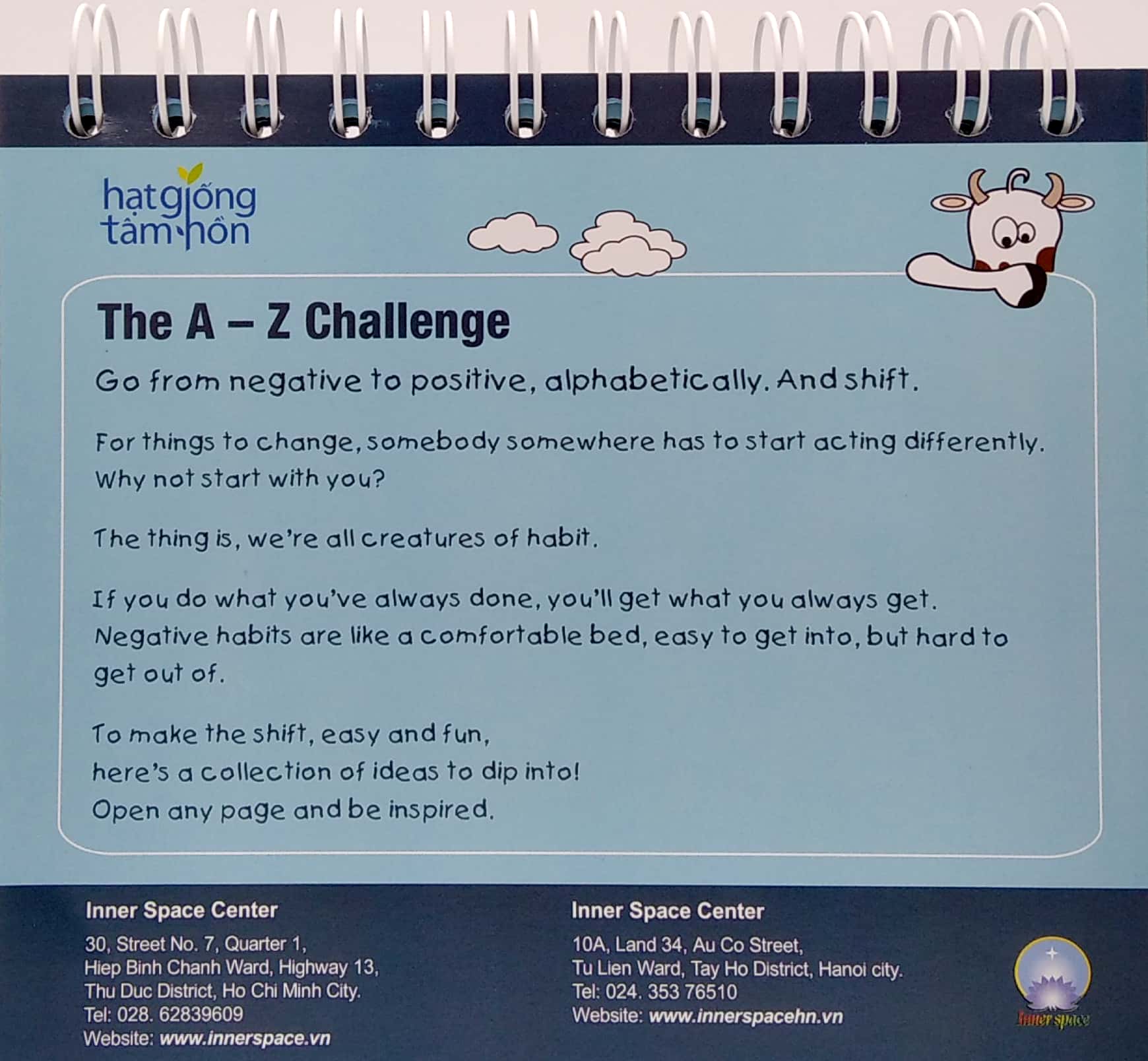 Dám Thay Đổi được First News mua bản quyền và biên dịch từ The A to Z Challenge của tập đoàn BK Publications, Anh Quốc. Đây là cuốn sách có ý nghĩa sâu sắc về tinh thần, đặc biệt là cho những người đang ở trong tâm trạng và hoàn cảnh không thuận lợi, nhàm chán; mong muốn được thay đổi thái độ và nội tâm để có một tinh thần lạc quan, tích cực hơn.