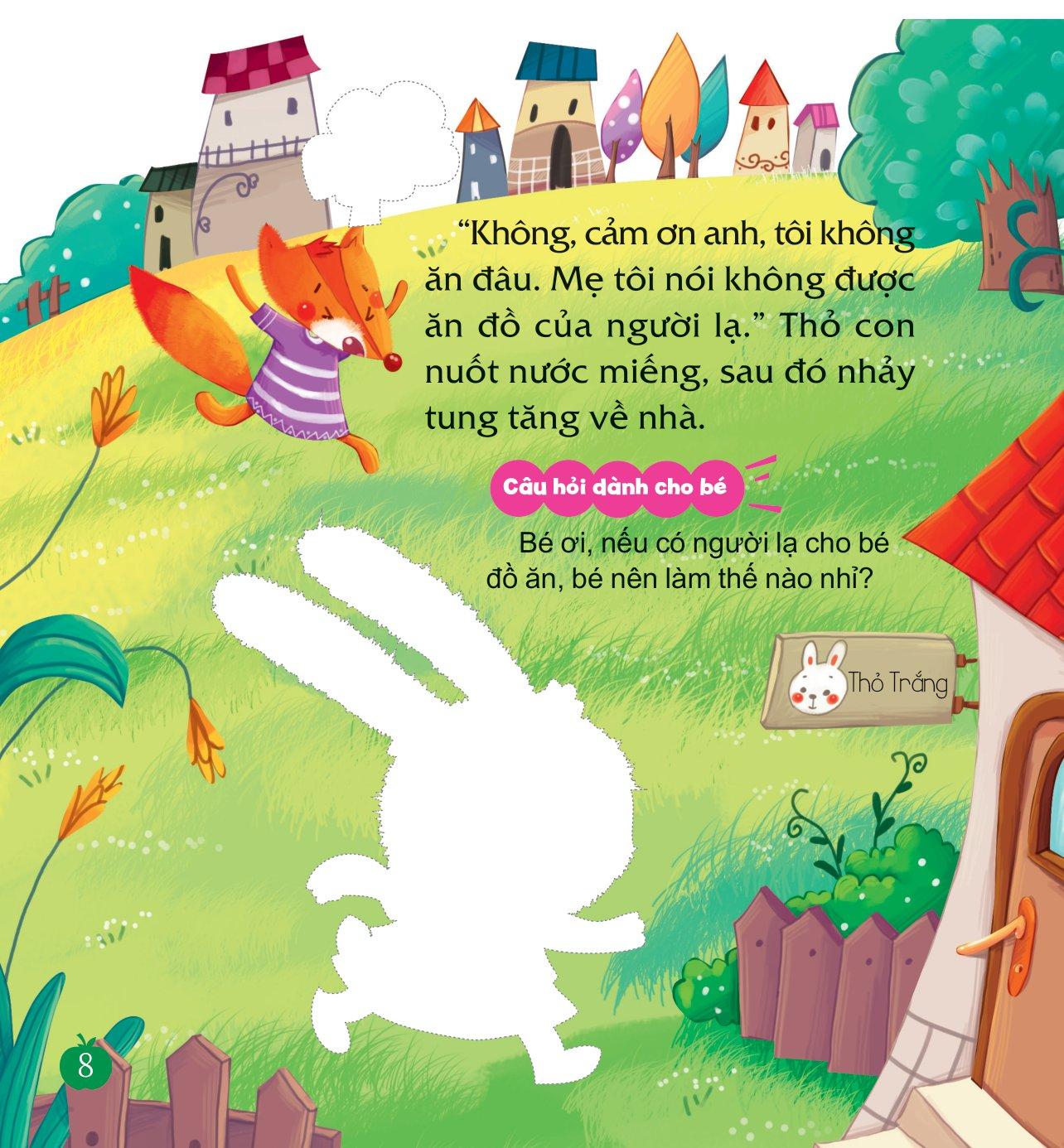 “Thỏ con ơi , mau lại đây ăn snack tôm nào!” Cáo đứng dưới gốc cây râm mát mời gọi bạn ấy. “Rồm rộp, rồm rộp”, Thỏ con nghe thấy tiếng nhai snack tôm giòn rụm của Cáo, lại ngửi thấy mùi thơm lừng nữa, khiến nước miếng của bạn ấy sắp chảy cả ra ngoài. “Không, cảm ơn anh, tôi không ăn đâu!” Thỏ con lắc đầu, vội vã đi nhanh về nhà.