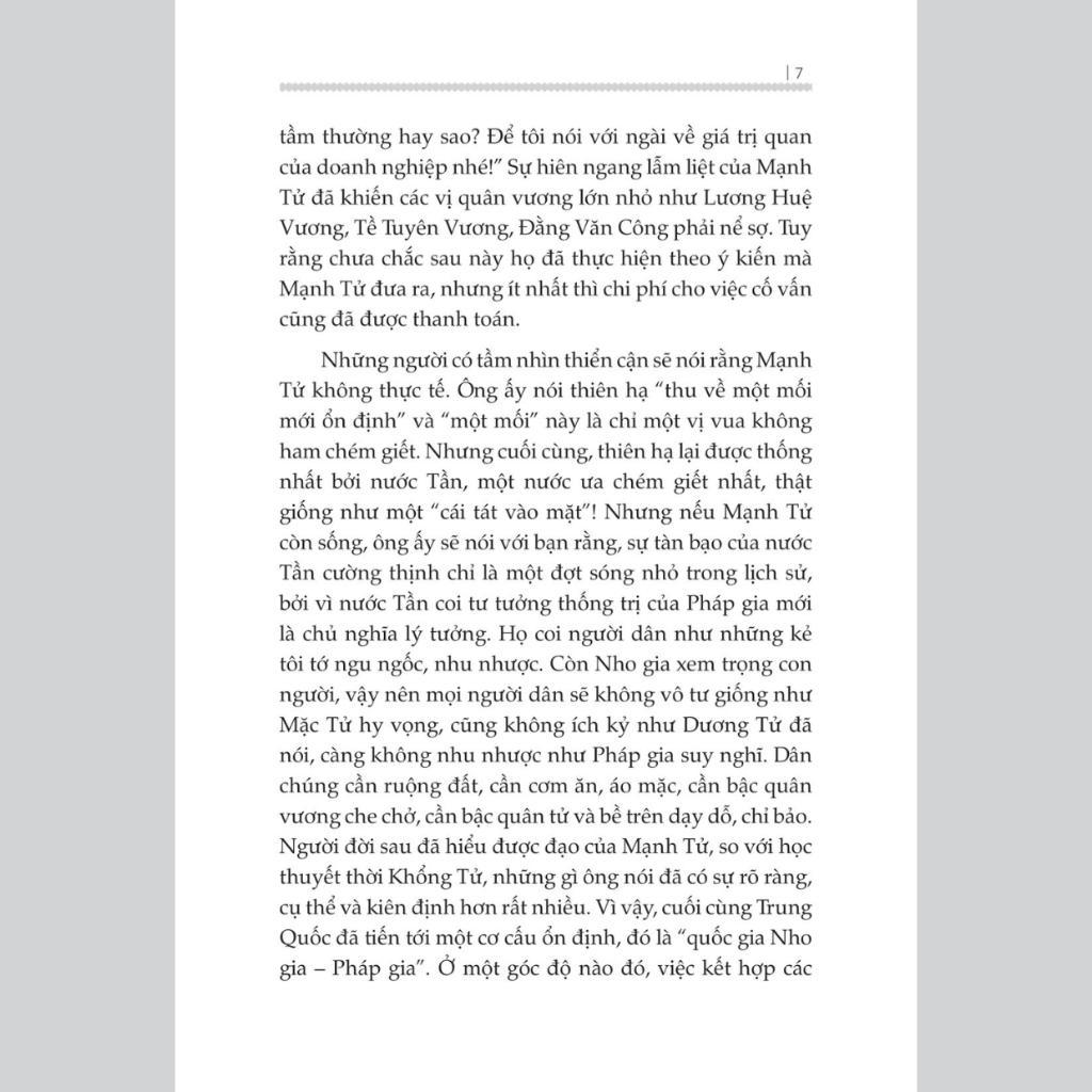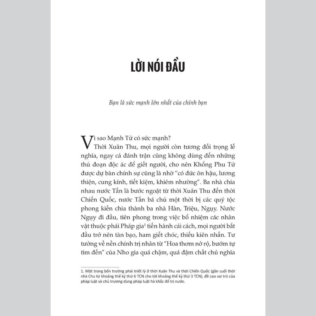 Mạnh Tử rất giỏi hùng biện, ông đã giảng một cách thấu đáo và sinh động về mệnh đề rộng lớn là “Tu thân, tề gia, trị quốc, bình thiên hạ”. Đồng thời ông cũng thể hiện được trải nghiệm sâu sắc và nhạy bén trong cách đối nhân xử thế tài tình của mình. Cho dù hiện tại, bạn đang tự mình kiên trì trên đường đời hay tạm thời lạc lối trước bước ngoặt của số phận, bạn sẽ có được phương hướng và dũng khí để tiếp tục tiến về phía trước thông qua cuốn sách này.