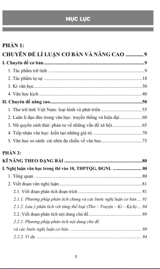 - Kĩ năng diễn đạt 4.1. Diễn đạt đúng 4.2. Diễn đạt hay PHẦN 2: CHUYÊN ĐỀ CƠ BẢN VÀ NÂNG CAO 2.1. Chuyên đề cơ bản 2.1.1. Tác phẩm trữ tình 2.1.2. Tác phẩm tự sự 2.1.3. Kí văn học 2.1.4. Văn học kịch 2.2. Chuyên đề nâng cao 2.2.1. Thơ trữ tình Việt Nam: loại hình và phát triển 2.2.2. Luân lí đạo đức trong văn học: truyền thống và hiện đại 2.2.3. Nữ quyền sinh thái: phản tư về những vấn đề xã hội 2.2.4. Tiếp nhận văn học: kiến tạo những giá trị 2.2.5. Văn học so sánh: cái nhìn đa chiều về văn học PHẦN 3: HỆ THỐNG ĐỀ THI, GỢI Ý, ĐOẠN VÀ BÀI THAM KHẢO