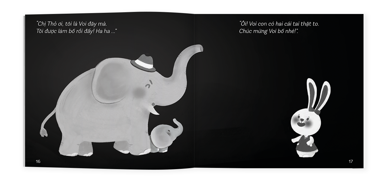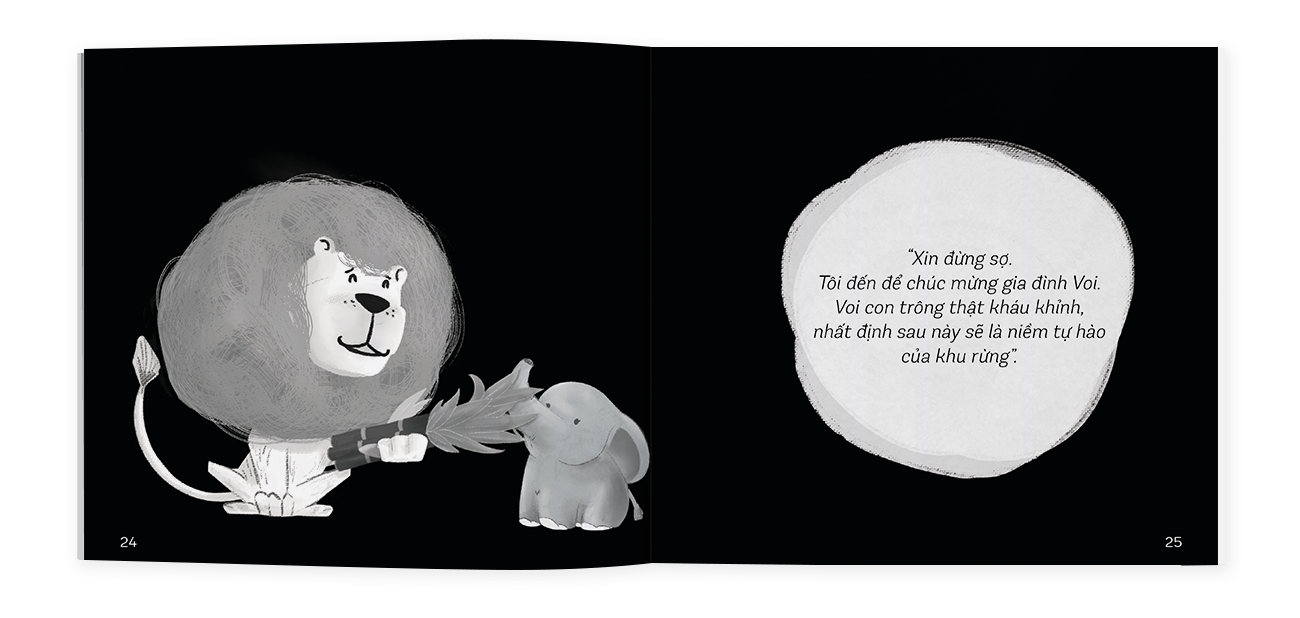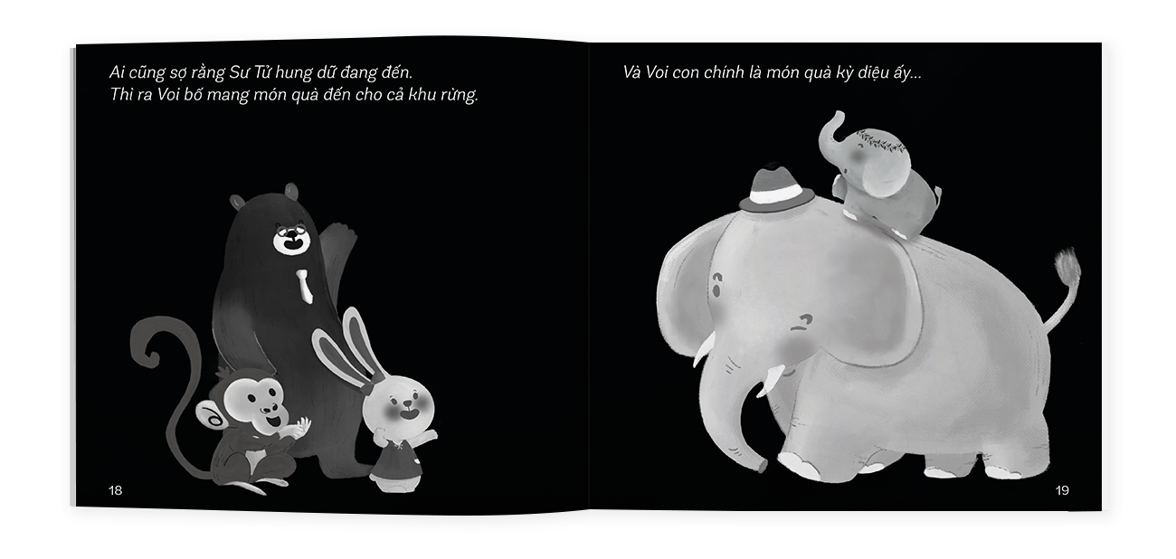 Mua tại TiktokVoi con đến rồi: Gia đình Voi hạnh phúc đón đứa con đầu lòng và muốn chia sẻ niềm vui ấy đến tất cả mọi người trong khu rừng. Voi bố bèn dẫn theo Voi con đến gõ cửa từng nhà. Nhưng tất cả mọi người đều lo lắng người đứng bên ngoài cửa là Sư Tử. Voi bố bèn giải thích hai bố con không phải là Sư Tử. Vì thế mà được mọi người đón tiếp và nhận những lời chúc tốt đẹp. Thế nhưng vào lúc tất cả đang ăn mừng thì Sư Tử xuất hiện. Sư Tử không đến để ăn thịt ai. Nó mang theo bó mía tặng Voi con và gửi lời chúc mừng đến gia đình Voi.
