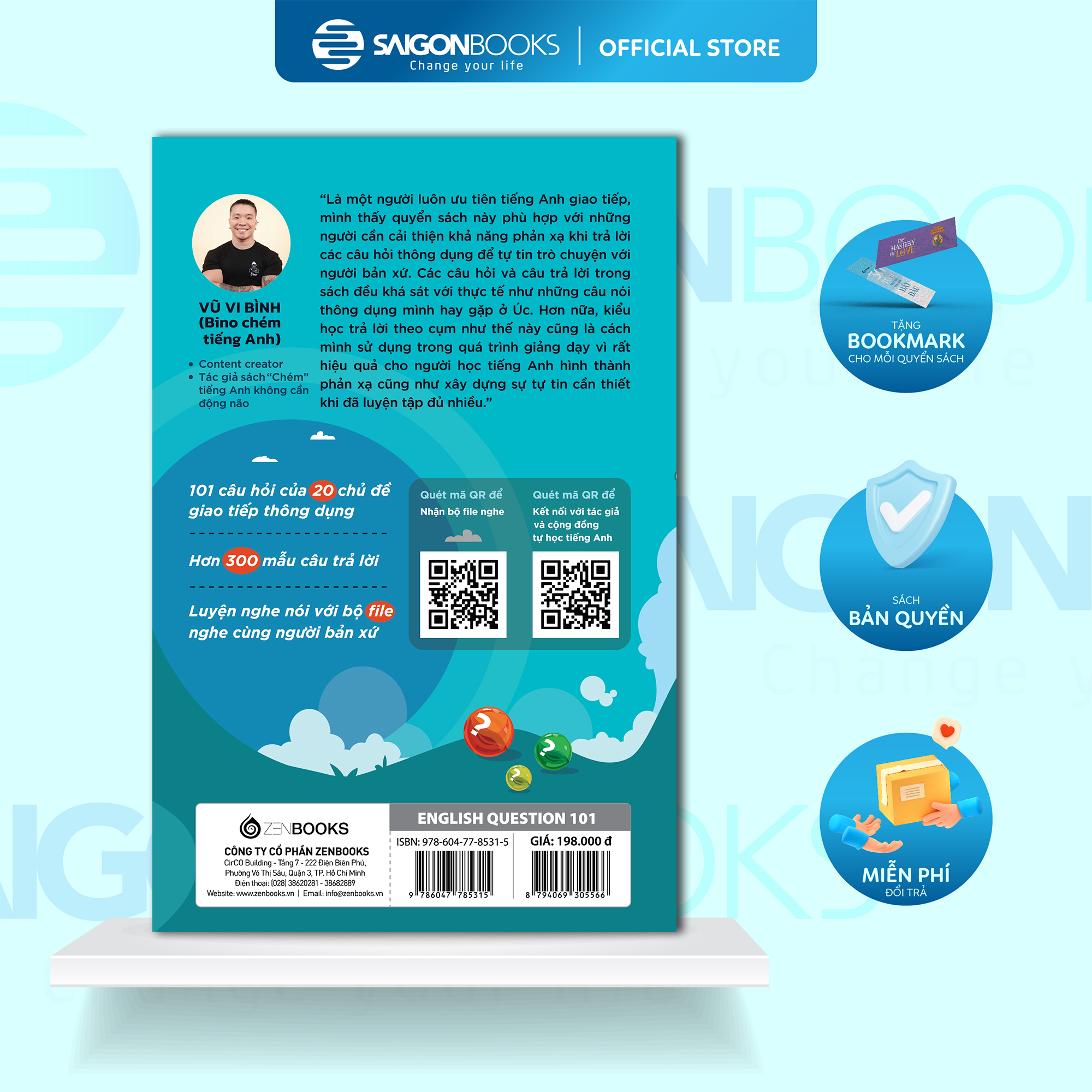 Lộ Trình Học Giao Tiếp Qua Q&A - English Question 101 (Zenbooks phát hành) là cuốn cẩm nang tự học nói tiếng Anh có nội dung khoa học, dễ hiểu và sát với thực tế, phù hợp với mọi đối tượng. Dù bạn mới tiếp cận với tiếng Anh hay đã học ngôn ngữ này từ lâu nhưng mãi vẫn chưa thể giao tiếp trôi chảy thì đều có thể bắt đầu với quyển sách này.