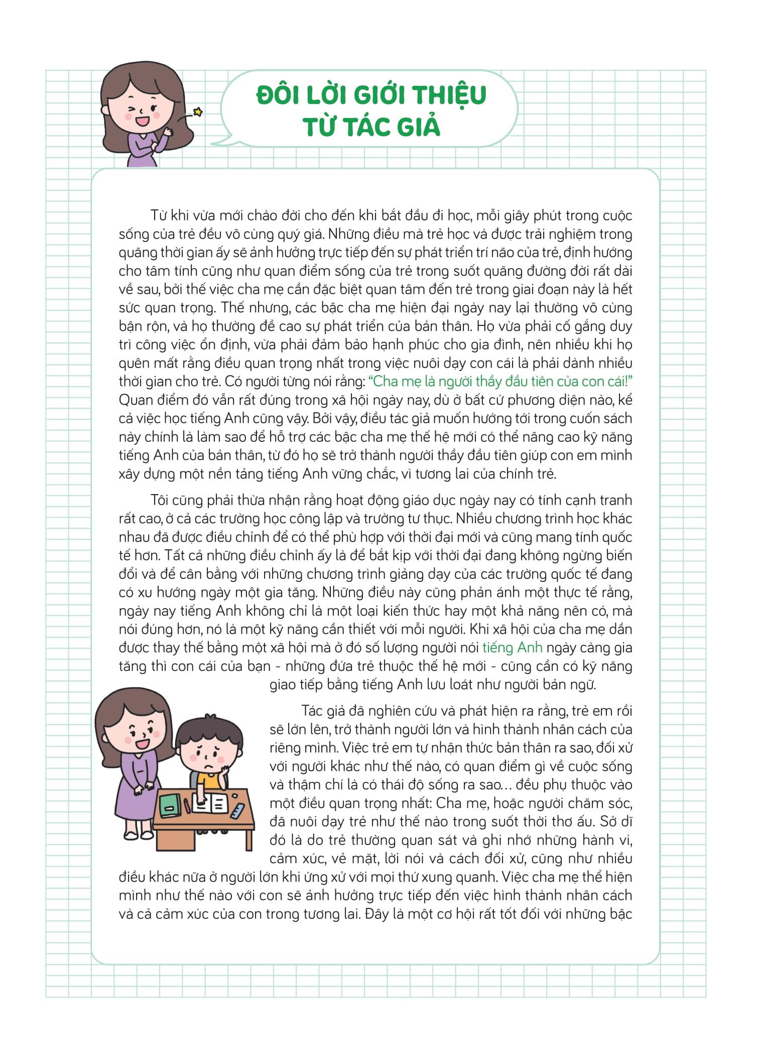 Với cuốn sách này, cha mẹ sẽ đồng hành bên con để học các từ mới, cách phát âm và cả các mẫu câu trọng yếu trong tiếng Anh. Trẻ sẽ học được nhiều điều quan trọng thông qua những đoạn hội thoại giữa các thành viên trong gia đình