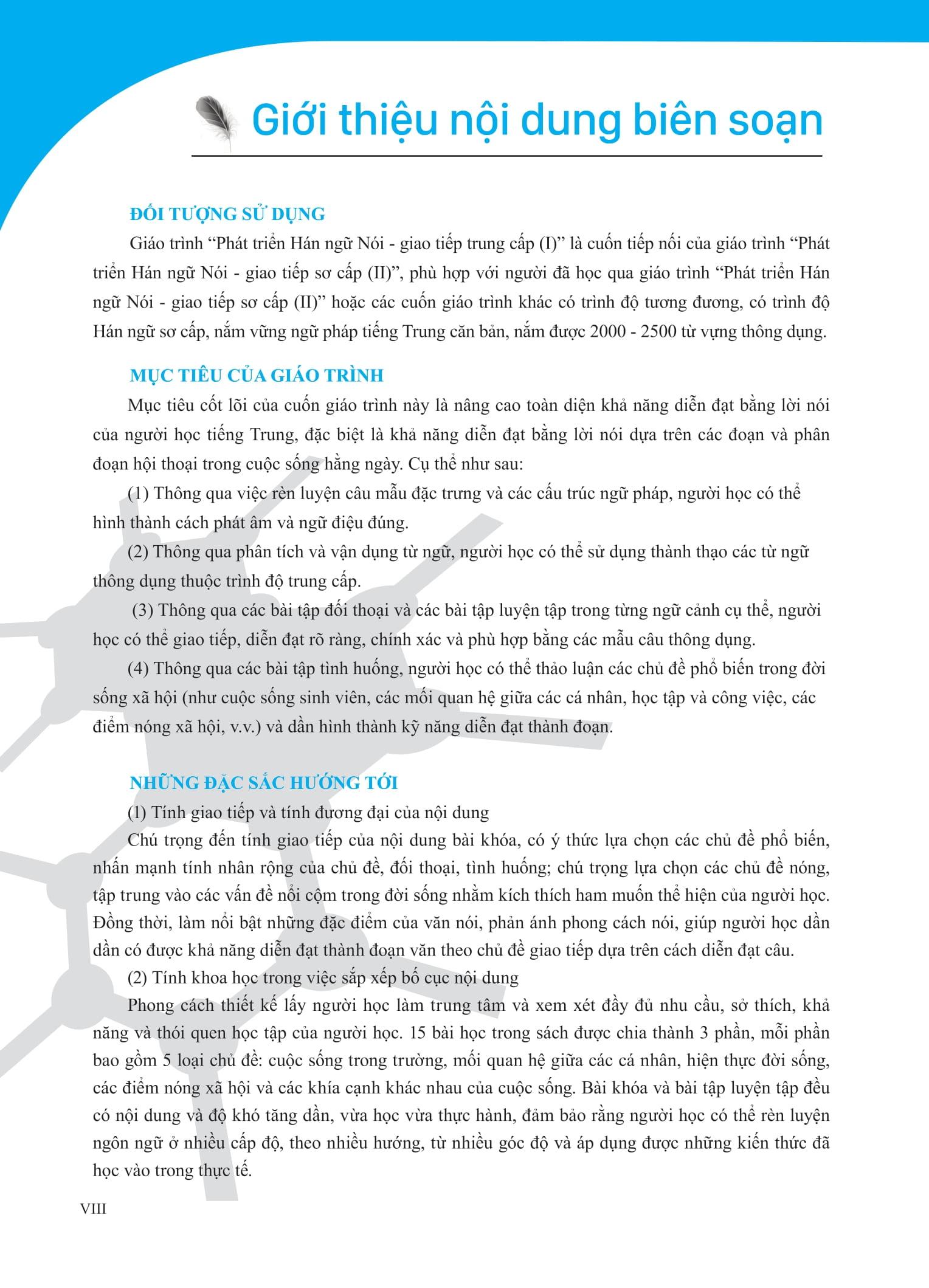 Đây là phần tiếp nối của Giáo Trình Phát Triển Hán Ngữ Nói – Giao Tiếp Sơ Cấp 2, hoặc dành cho những ai đã có nền tảng tiếng Trung cơ bản và muốn nâng cấp kỹ năng của m.ình. Đối tượng phù hợp để sử dụng cuốn sách này:
