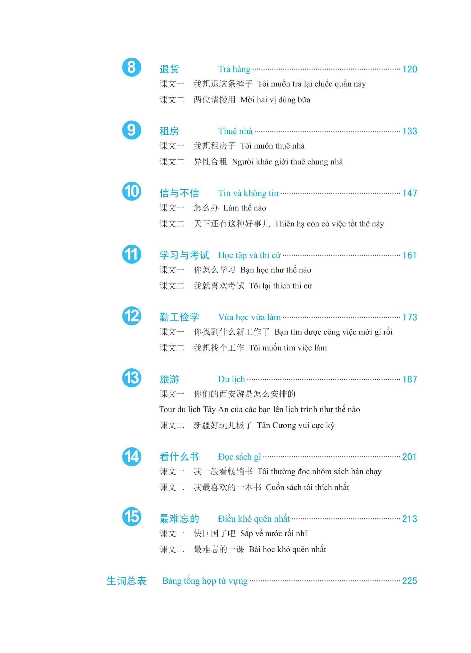Cuốn sách này bao gồm 15 bài học với các chủ đề thực tế trong văn hóa giao tiếp của người Trung Quốc. Mỗi bài học có các phần sau: