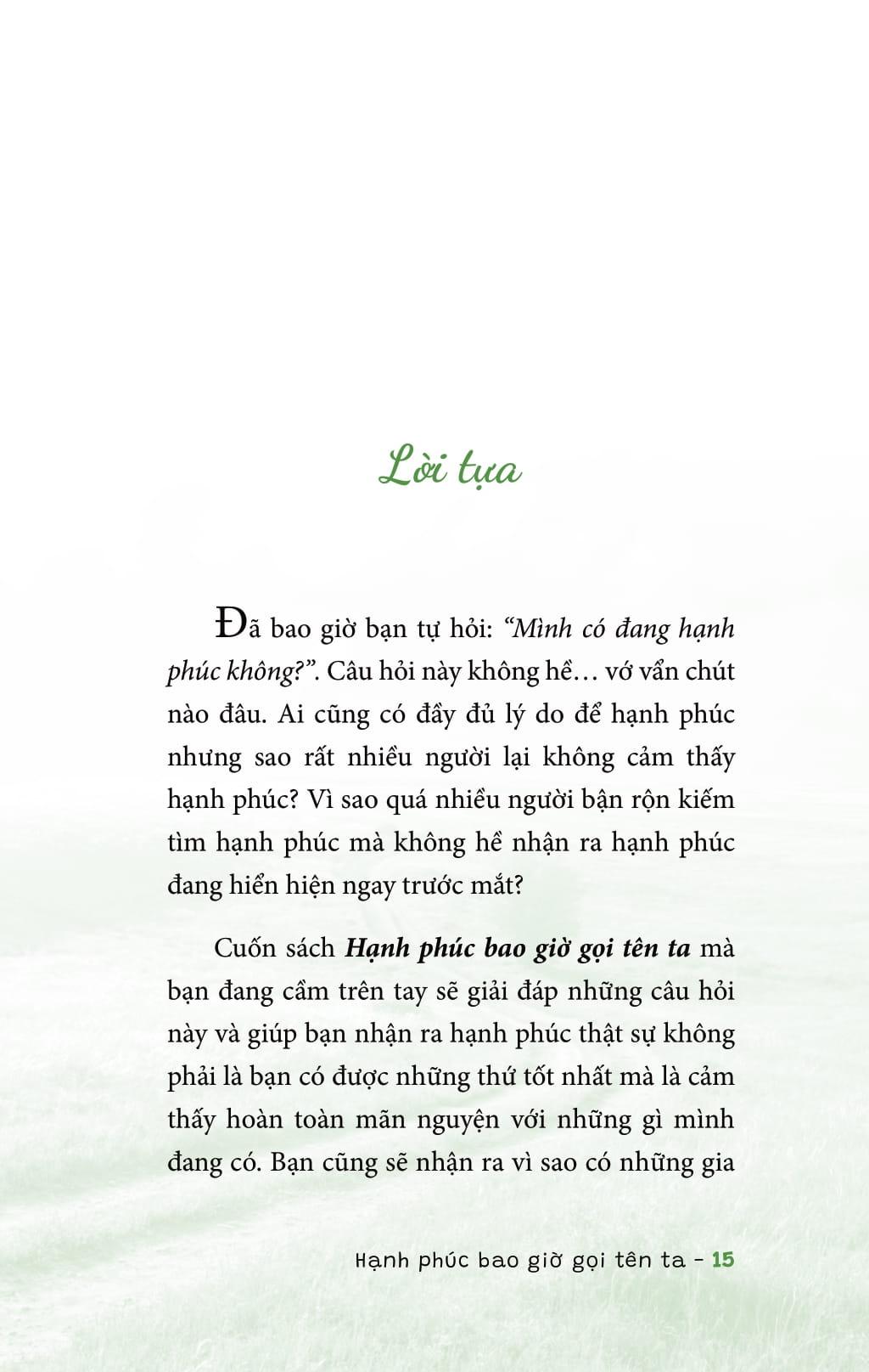Cuốn sách "Hạnh Phúc Bao Giờ Gọi Tên Ta" của tác giả My Holland là một hành trình khám phá sâu sắc về khái niệm hạnh phúc và cách để từng bước xây dựng nó trong cuộc sống hằng ngày. Được viết bằng giọng văn chân thành, gần gũi, cuốn sách không chỉ mang đến những lý thuyết về tâm lý học mà còn là những trải nghiệm thực tế, bài học quý giá từ chính cuộc sống của tác giả.
