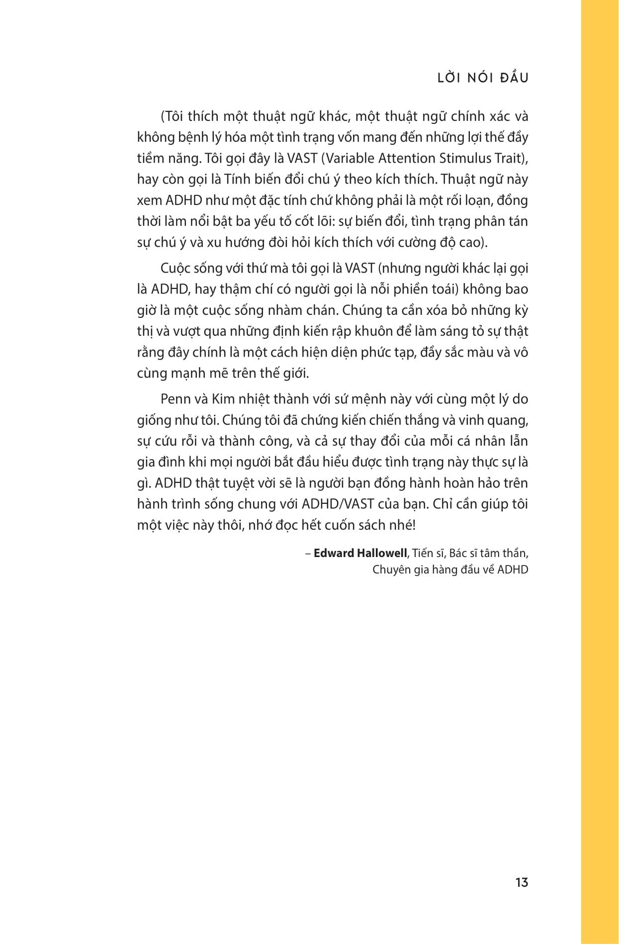 Đọc cuốn sách này, bạn sẽ cười vì những tình huống khó đỡ, sẽ thấy lòng m.ình nhẹ đi khi nhận ra m.ình không hề đơn độc, và sẽ tìm thấy những công cụ để sống hài hòa hơn với bộ não khác biệt của m.ình. Hiểu về ADHD không hứa hẹn biến mọi thứ trở nên hoàn hảo, nhưng chắc chắn sẽ giúp bạn nhận ra: bạn không phải là một mớ hỗn độn hay một thảm họa, bạn là một con người đầy màu sắc, và thế giới này cần sự hiện diện của bạn đúng như bạn vốn có.