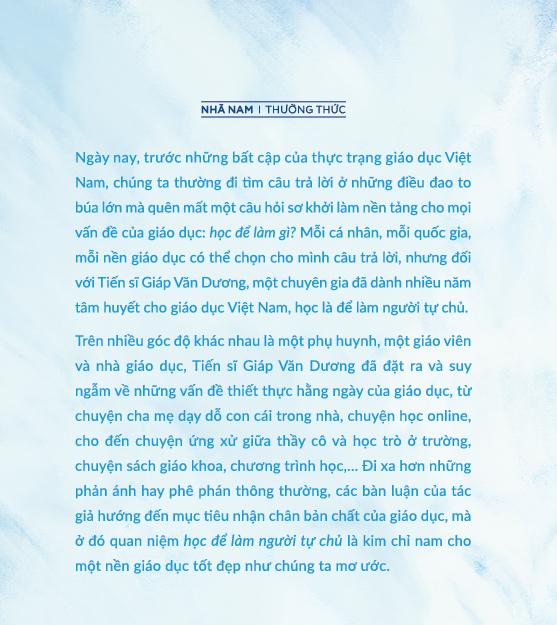 Tác giả GIÁP VĂN DƯƠNG Nhà xuất bản Công Thương Kích thước 20.5 x 14 x cm Số trang 324 Ngày phát hành 2024 Giới thiệu sách Ngày nay, trước những bất cập của thực trạng giáo dục Việt Nam, chúng ta thường đi tìm câu trả lời ở những điều đao to búa lớn mà quên mất một câu hỏi sơ khởi làm nền tảng cho mọi vấn đề của giáo dục: học để làm gì? Mỗi cá nhân, mỗi quốc gia, mỗi nền giáo dục có thể chọn cho mình câu trả lời, nhưng đối với Tiến sĩ Giáp Văn Dương, một chuyên gia đã dành nhiều năm tâm huyết cho giáo dục Việt Nam, học là để làm người tự chủ. Trên nhiều góc độ khác nhau là một phụ huynh, một giáo viên và nhà giáo dục, Tiến sĩ Giáp Văn Dương đã đặt ra và suy ngẫm về những vấn đề thiết thực hằng ngày của giáo dục, từ chuyện cha mẹ dạy dỗ con cái trong nhà, chuyện học online, cho đến chuyện ứng xử giữa thầy cô và học trò ở trường, chuyện sách giáo khoa, chương trình học... Đi xa hơn những phản ánh hay phê phán thông thường, các bàn luận của tác giả hướng đến mục tiêu nhận chân bản chất của giáo dục, mà ở đó quan niệm học để làm người tự chủ là kim chỉ nam cho một nền giáo dục tốt đẹp như chúng ta mơ ước.
