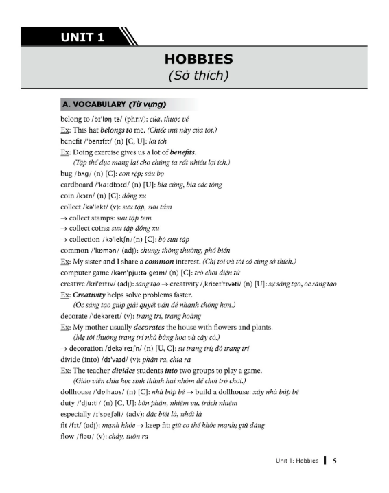 - Từ vựng (Vocabulary): gồm tất cả các từ mới trong bài; các từ được phiên âm theo hệ phiên âm quốc tế, có nghĩa sát với nghĩa trong bài học và có một số ví dụ minh họa.