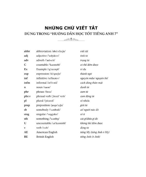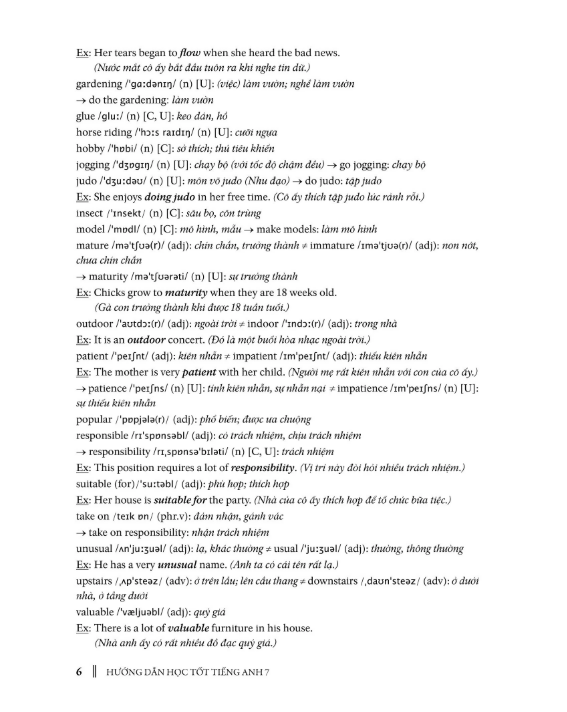 - Bài giải và bài dịch (Solutions & Translations): giải và dịch tất cả các bài hội thoại, bài đọc, bài nghe trong sách giáo khoa. (Lưu ý: Học sinh cần tự làm bài tập và nghe đĩa CD trước khi tham khảo phần này). Cuốn sách này sẽ giúp ích nhiều cho các em học sinh trong việc học tập Tiếng Anh, đồng thời cũng là tài liệu hữu ích cho các phụ huynh và thầy cô giáo trong việc hướng dẫn các em học tốt Tiếng Anh 7.